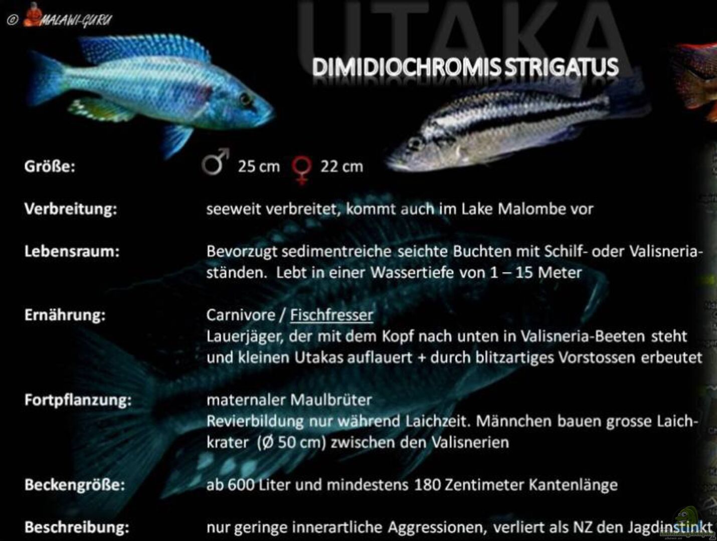 1/2 Dimidiochromis strigatus 1/2 Aristochromis christyi 5 synodontis multipunctatus 1/2 nimbochromis venustus 2 nimbochromis livingstonii 1 sciaenochromis fryeri -ahli Snow white 2/3 Cyrtocara moorii Bei manchen kann ich leider noch nicht das Geschlecht erkennen.