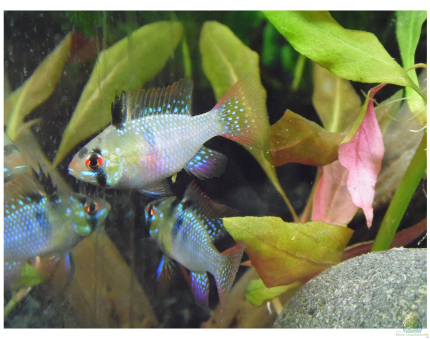 Ein Pärchen Mikrogeophagus ramirezi Schmetterlingsbuntbarsche kann man an der dunklen Querbinde, die von der Kopfoberseite über das Auge zieht, sowie am dunklen Fleck unter der Rückenflosse erkennen. Bei der Geschlechtsreife verlängern sich die Rücken- und Afterflosse des Männchens. Besonders auffällig sind hierbei die fahnenartig ausgezogenen vorderen Strahlen der Rückenflosse. Die Weibchen, die etwa 1 cm kleiner bleiben, erkennt man an ihrer rotgefärbten Bauchpartie. 13 Funkensalmler Hyphessobrycon [...]