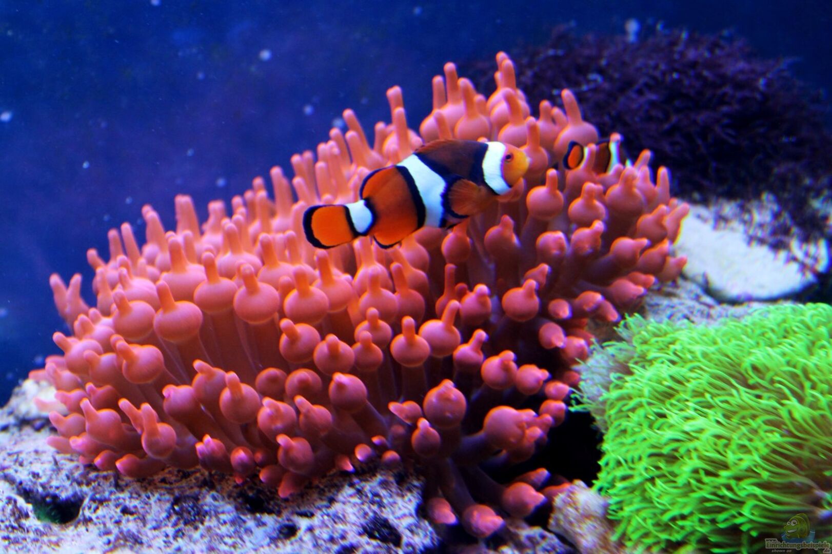 Alpheus ochrostriatus zusammen mit Cryptocentrus cinctus 1 Gobiodon histrio 1 Paar Amphiprion percula 1 Salarias fasciatus 1 Lybia tesselata 3 Lysmata debelius ein paar Einsiedler (Calcinus laevimanus) Tectus conus Schnecke