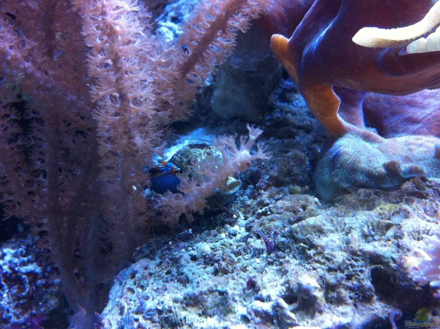 Alpheus ochrostriatus zusammen mit Cryptocentrus cinctus 1 Gobiodon histrio 1 Paar Amphiprion percula 1 Salarias fasciatus 1 Lybia tesselata 3 Lysmata debelius ein paar Einsiedler (Calcinus laevimanus) Tectus conus Schnecke