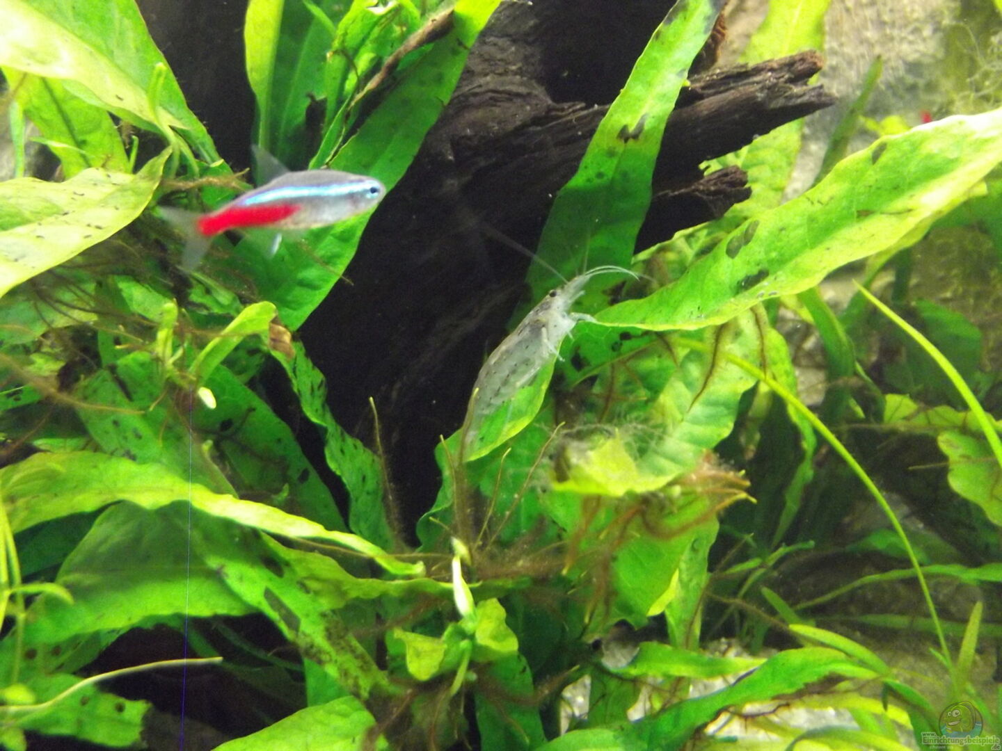 Grober Bereich: Südamerika 8 Guppys (2M / 6W) 22 Neonsalmler 10 Amanogarnelen 1 Brauner Antennenwels div. Schnecken, als "Regenwürmer" und Gesundheitspolizei (falls mal ein Fisch im Dickicht verendet und nicht sofort gesehen wird)
