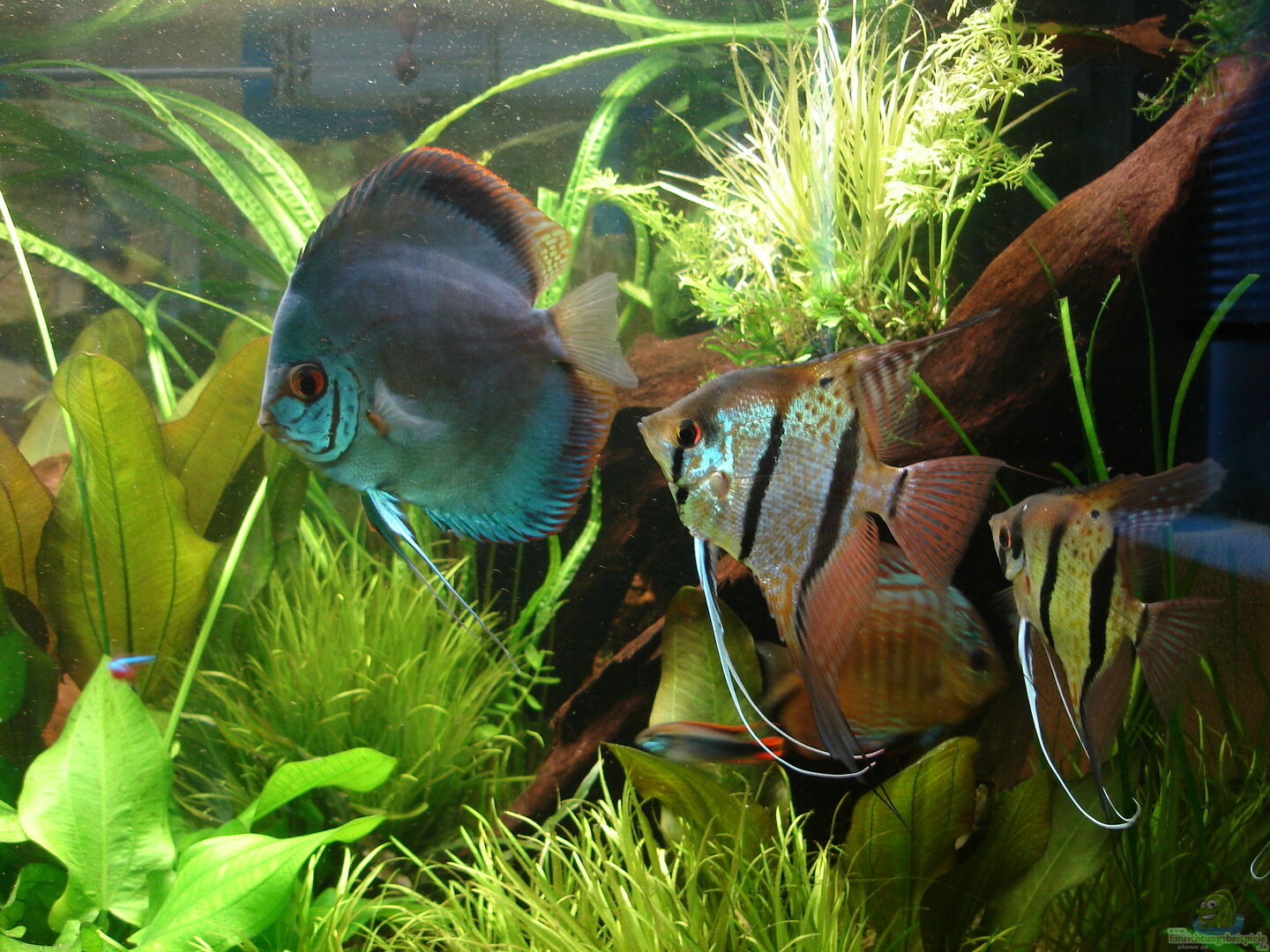wechselnd Diskusfische, leider war das Mobbing sehr gro??, sodass zu Schluss nur noch 1 Paar übrig blieb, dann nur noch das Weibchen. Dann habe ich umgestellt auf Skalare u.a. Diverse Beifische, wie Neons, Corydoras, 3 Sturisome und Rotkopfsalmler