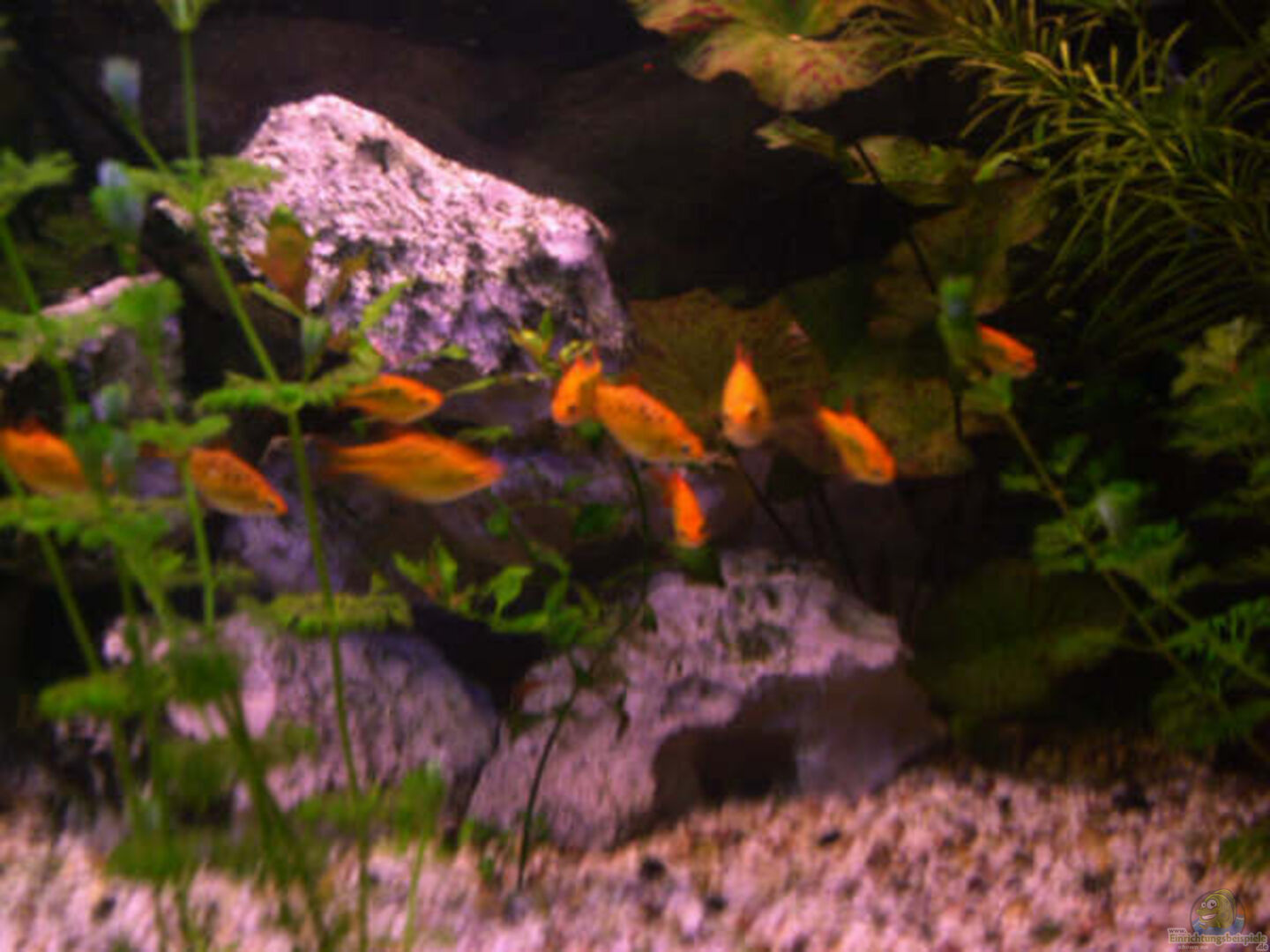 *5 Haibarbe (Balantiocheilus melanopterus) *10 Brokatbarbe, auch Messingbarbe (Puntius schuberti) *5 Platys (Xiphophorus maculatus) *20 Rote Neons (Kardinaltetra, Paracheirodon axelrodi) *4 Küssende Guramis (Helostoma temminkii) *2 Mosaikfadenfische (Trichogaster leeri) *3 Corydoras sterbai *2 Fadenfische (Trichogaster trichopterus) *15 Kupfersalmler (Hasemania nana) *15 Glühlichtsalmler (Hemigrammus erythrozonus) *3 blaue Antennenwelse (Ancisturs dolichopterus)