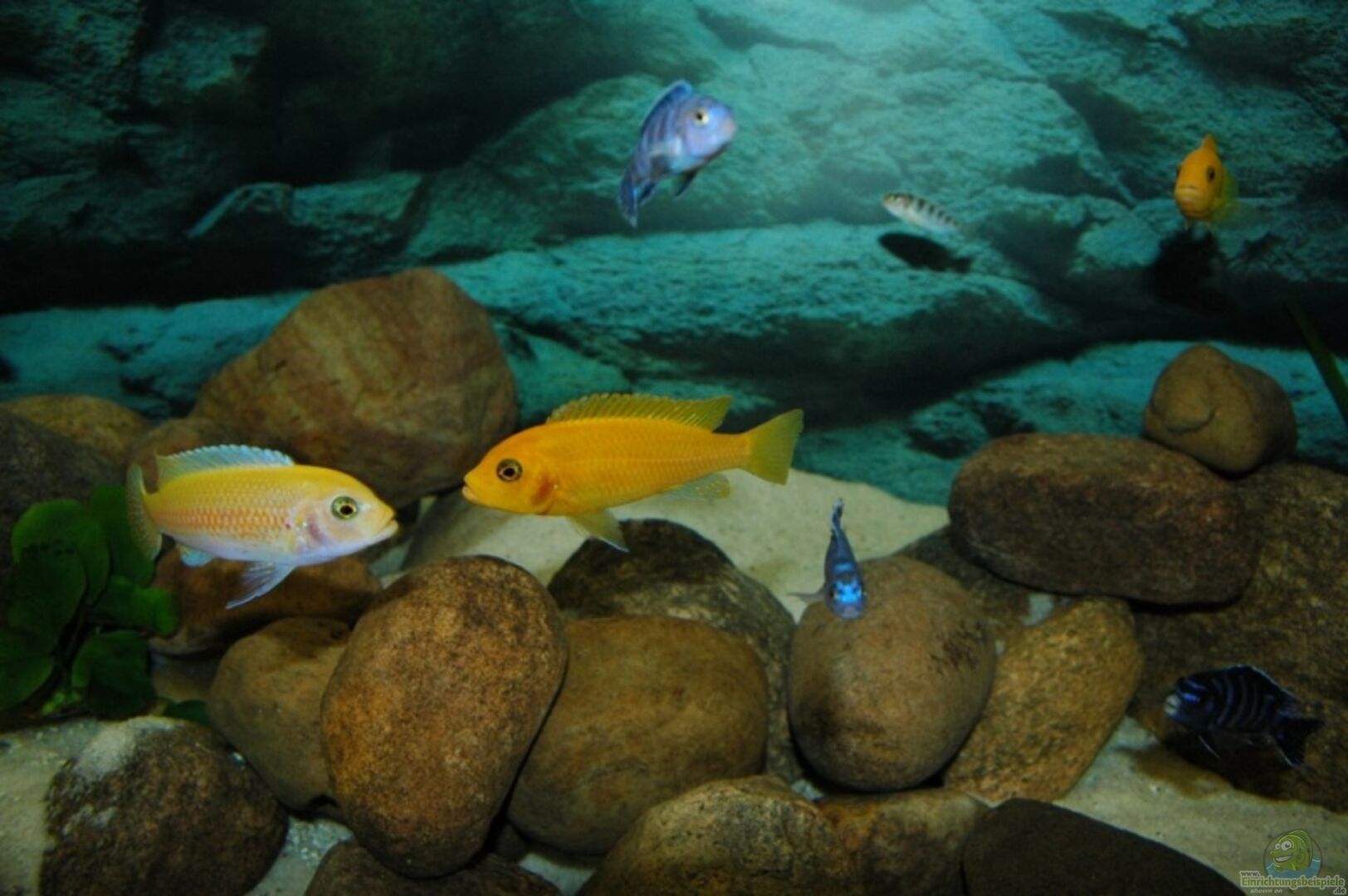 Demasonis, Yellows und Zebras wurden mit dem Becken übernommen, auf Nachfrage beim Züchter wurden mir weitere Demasoni Jungtiere und Lombardois sowie eine Aufstockung der Yellows nahegelegt. - 3/7 Labidochromis caeruleus yellow - 2/3 Pseudotropheus demasoni plus 5 Jugendliche - 1/3 Pseudotropheus zebra - 1/4 Pseuotropheus lombardoi