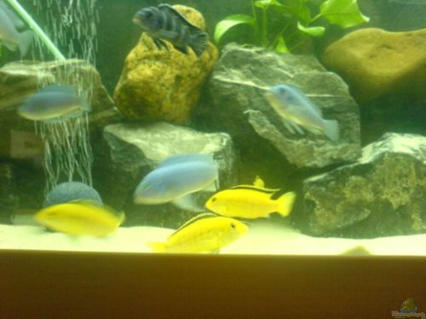 1/4 Pseudotropheus socolofi (WF) 1/4 Labidochromis yellow (F1) 1/4 Labidochromis perlmutt (F2) 1/3 Pseudotropheus demasoni ---Die auf dem Bild sichtabrn copadichromis borleyi sind ebreits ausgezogen, w erde demnächst aktuelle Bilder machen -----ich wei?? dass die Pseudotropheus demasoni als recht ruppig gehalten werden, jedoch ist das bei mir völlig anders. Ich habe die Fische slebst gro??gezogen und sie sind bisher noch völlig gfrei von Aggressionen.