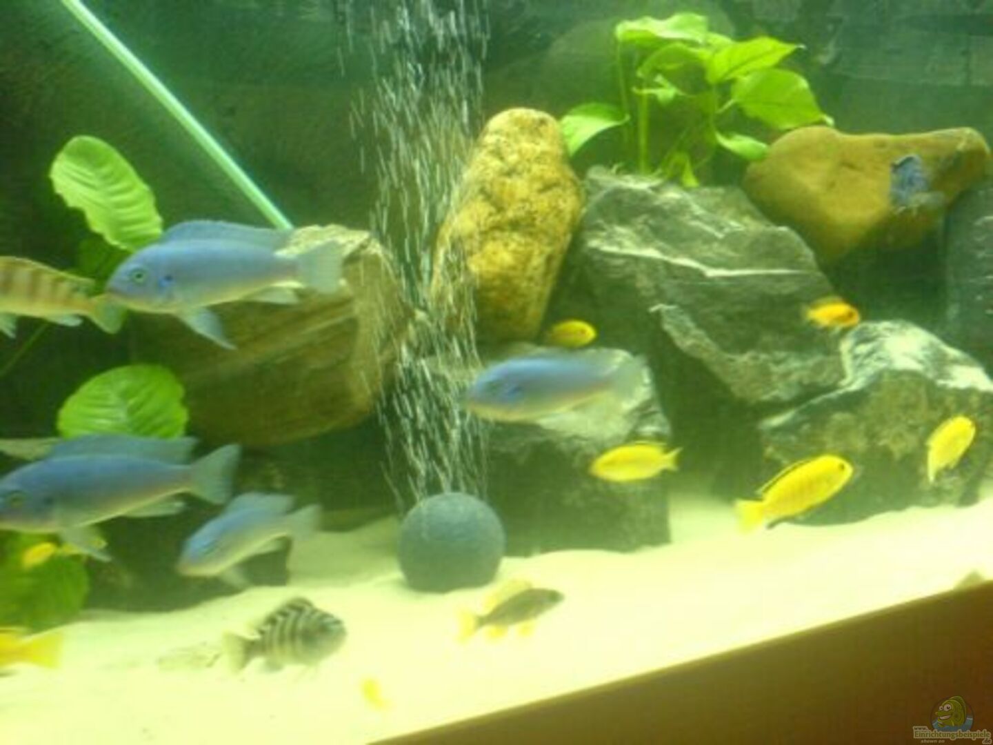 1/4 Pseudotropheus socolofi (WF) 1/4 Labidochromis yellow (F1) 1/4 Labidochromis perlmutt (F2) 1/3 Pseudotropheus demasoni ---Die auf dem Bild sichtabrn copadichromis borleyi sind ebreits ausgezogen, w erde demnächst aktuelle Bilder machen -----ich wei?? dass die Pseudotropheus demasoni als recht ruppig gehalten werden, jedoch ist das bei mir völlig anders. Ich habe die Fische slebst gro??gezogen und sie sind bisher noch völlig gfrei von Aggressionen.