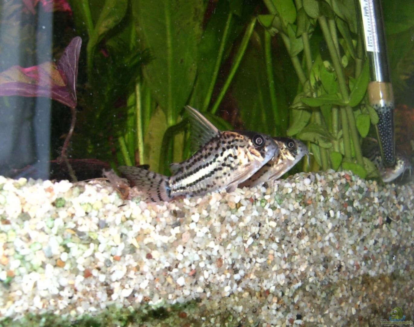 10 rote Neons (Paracheirodon axelrodi ) 2 Zwergfadenfische m/w (Colisa lalia) 1 Keilfleckbärbling (Trogonostigma heteromorpha) 2 Zwergschilderwelse (L38 Peckoltia sp. oder L15 Peckoltia vittata?) 3 Dreilinienpanzerwelse (Corydoras trilineatus) oder Leopardpanzerwelse (Corydoras julli) 7 Amanogarnelen (Caridina japonica)