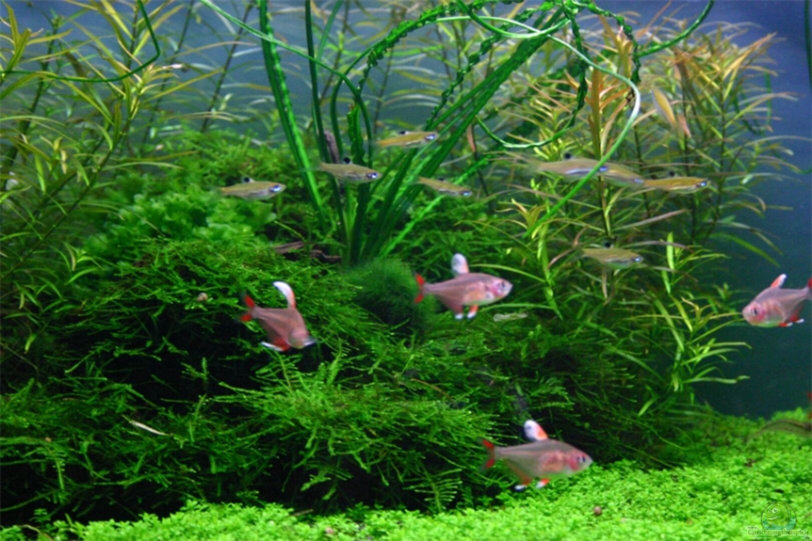 Fische: 17 Leuchtaugenrasbora (Rasbora dorsiocellata macrophthalma) 5 Schmucksalmler (Hyphessobrycon rosaceus) Garnelen: fünf Armano-garnelen Schnecken: zwei Rennschnecken einige Turmdeckelschnecken