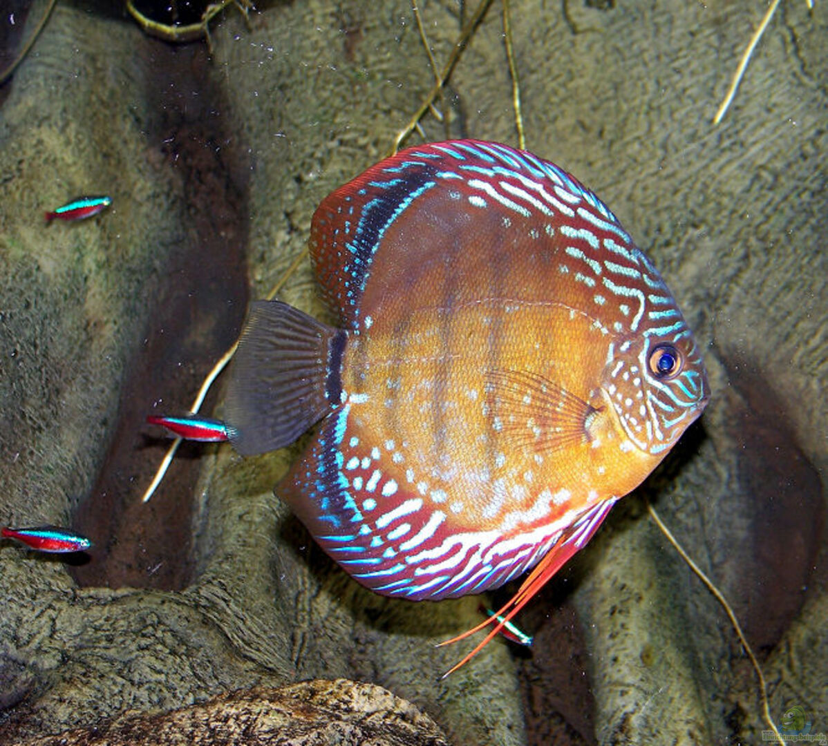 Besetzt wurde das Becken mit ..... folgenden Diskus Wildfängen 3x Tefé Spotted 1x Nhamunda blue 3x Mari Mari Die Beifische: Ca. 50 Rote Neons 10 Corydoras Sterbai + 6 eigene NZ 5 L107