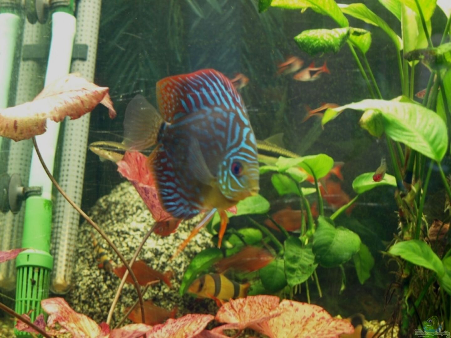 2 Diskus snakskin blau 2 Diskus Kobald blau 2 Diskus Malboro rot 8 Keilflbarben 4 Harnichwelse (den Namen kenne ich leider nicht) 6 Goridoras Der Feuerschwanz ist jetzt nicht mehr im Becken, dafür habe ich zwei Prachtschmerlen eingesetzt. (Hatte mir mit neuen Pflanzen Schnecken eingefangen, die sich sehr schnell vermehrten!).