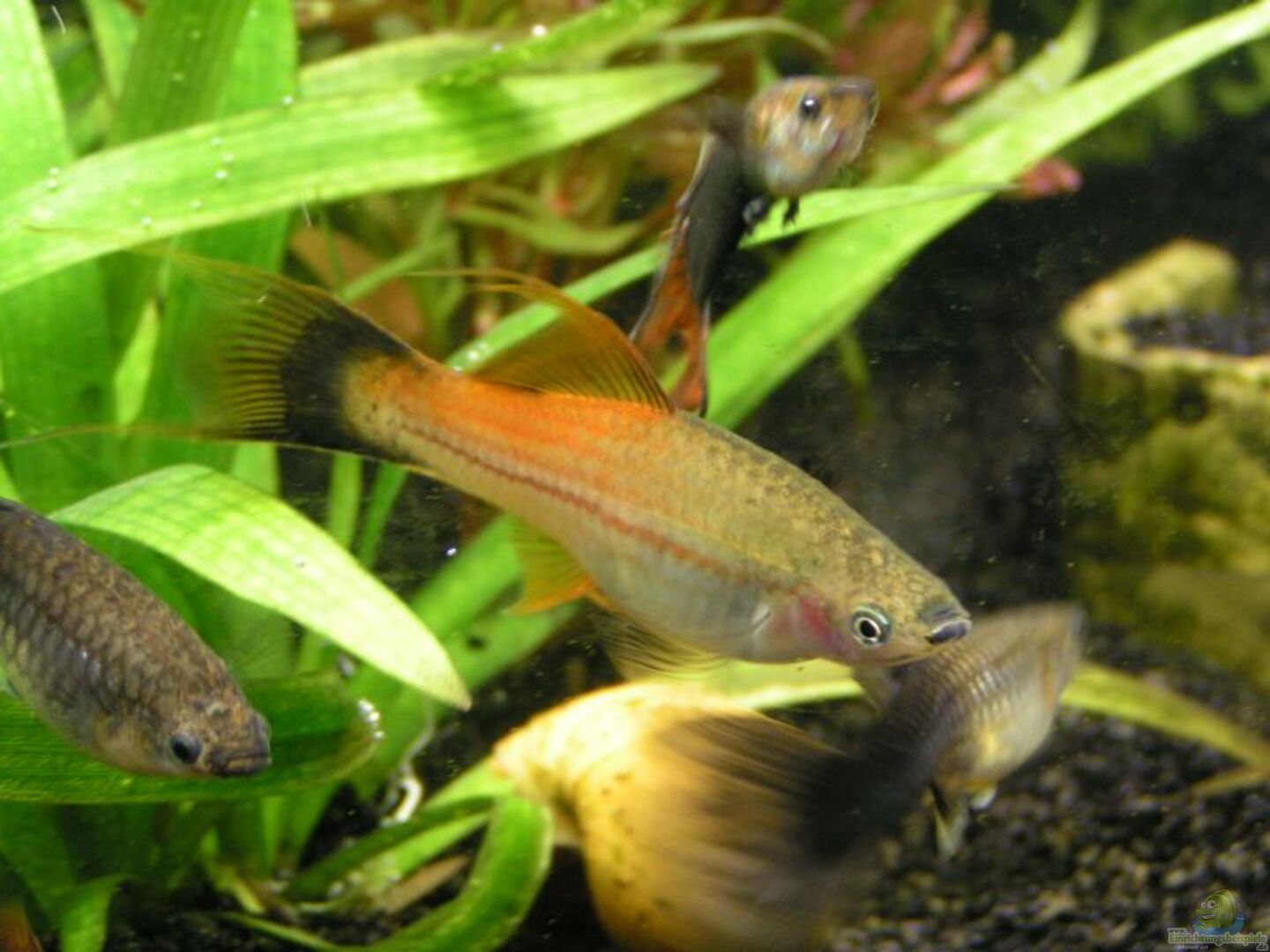 3 Schwetträger (Xiphophorus helleri) 15 Guppy (Poecilia reticulata) 3 Trauermantelsalmler (Gymnocorymbus ternetzi) 2 Siamesische Rüsselbarben (Gyrinocheilus aymonieri) 2 gepunktete Fadenfische (Trichogaster trichopterus) 5 Antennenwelse (Ancistrus spec.)