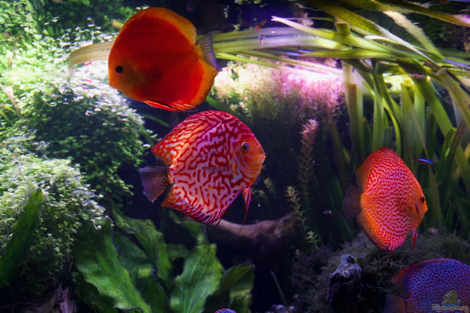 Die Bewohner des Aquariums : 13x Stendker Diskus, verschiedene Farbschläge, (Symphysodon aequifasciatus) 20x Roter Neon, (Paracheirodon axelrodi) 20x Guppies, (Poecilia reticulata) 5x Corydoras sterbai 8x Corydoras arcuatus 1x Corydoras julii 2x Villavicencio Zwergbuntbarsch, (Apistogramma macmasteri) 2x Kakadu Zwergbunzbarsch, (Apistogramma cacatuoides) 2x Schachbrett Zwergbuntbarsch, (Dicrossus maculatus) 1x Ringelsocken Harnischwels L47, (Panaqolus albivermis) 4x Blauer [...]
