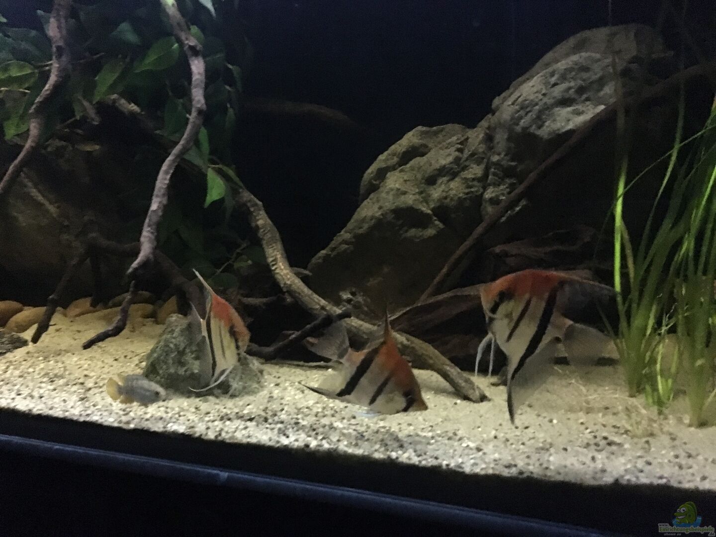 2Pterophyllum cf. scalare "Lago Manacapuru 1| 1 (Spannweite der Tiere per 20.03. ca. 10cm; per 25cm)April 2020 30cm 4 Pterophyllum scalare ( Juvenile eingezogen am 13.5.2019), Spannweite per April 2020 20cm 15 Moenkhausia sanctaefilomenae 1 Farlowella acus L 103 Peckoltia pulcher 15 Corydoras leucomelas 4 Bunocephalus coracoideus Anentome helena