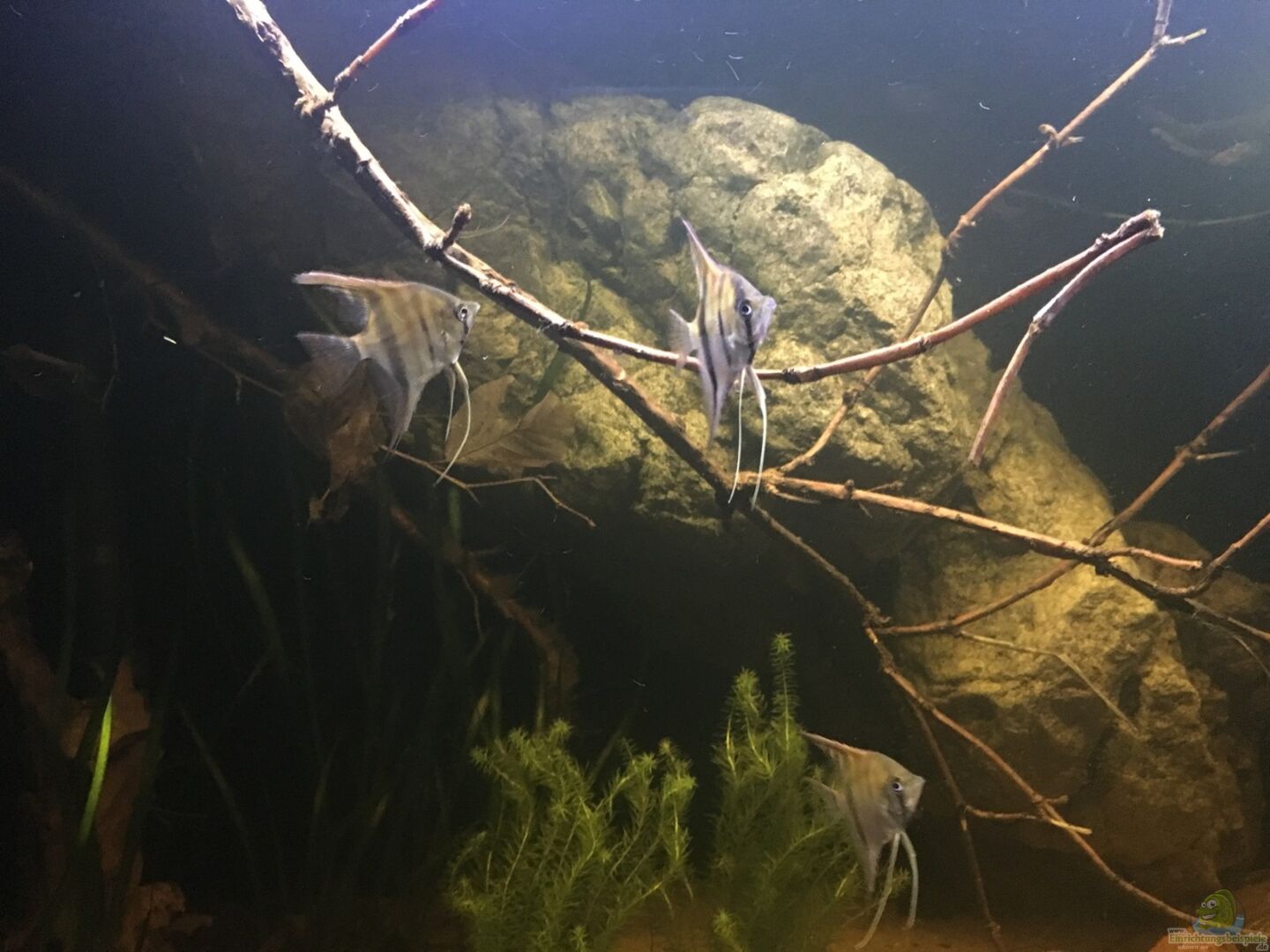2Pterophyllum cf. scalare "Lago Manacapuru 1| 1 (Spannweite der Tiere per 20.03. ca. 10cm; per 25cm)April 2020 30cm 4 Pterophyllum scalare ( Juvenile eingezogen am 13.5.2019), Spannweite per April 2020 20cm 15 Moenkhausia sanctaefilomenae 1 Farlowella acus L 103 Peckoltia pulcher 15 Corydoras leucomelas 4 Bunocephalus coracoideus Anentome helena