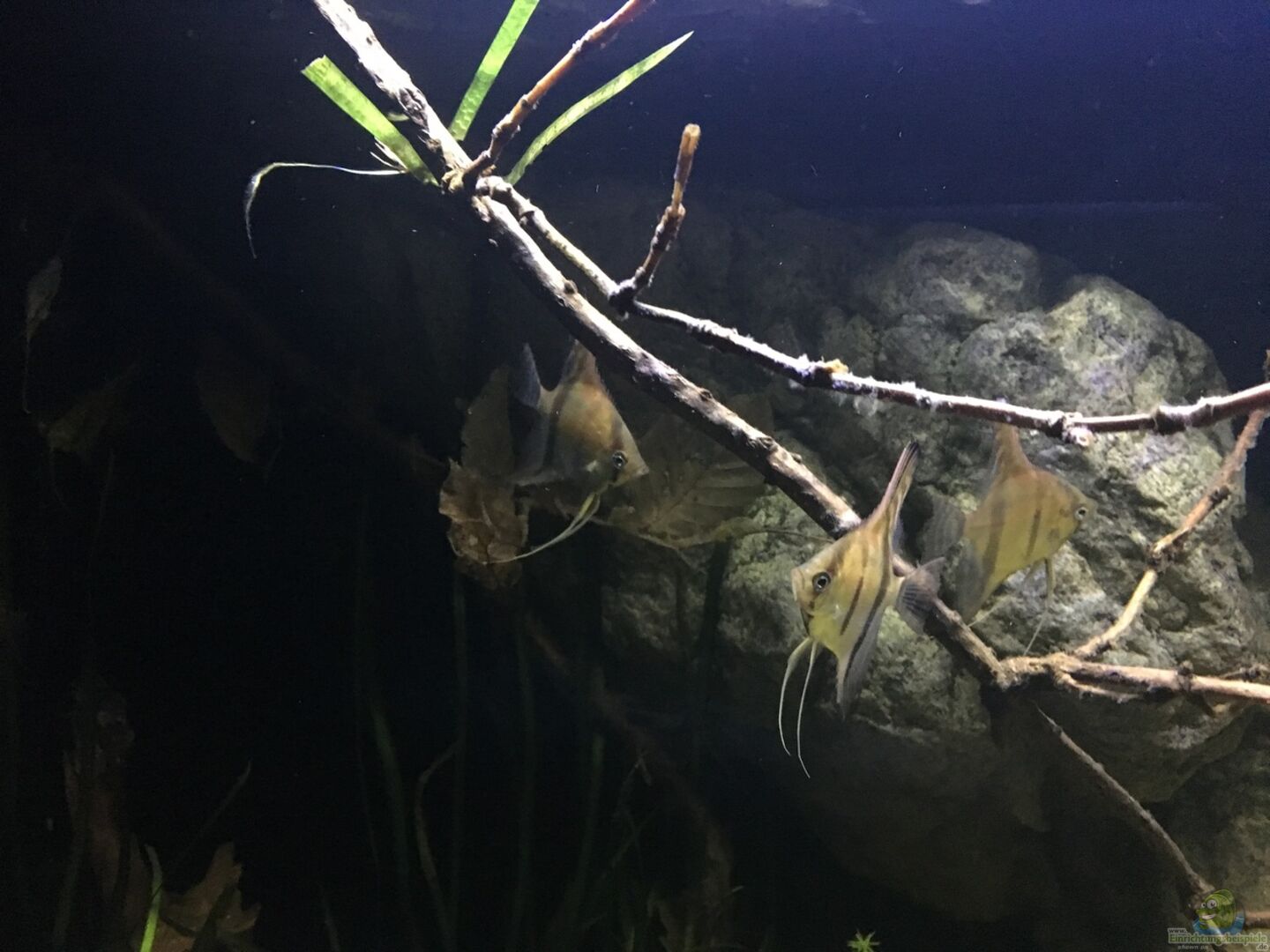 2Pterophyllum cf. scalare "Lago Manacapuru 1| 1 (Spannweite der Tiere per 20.03. ca. 10cm; per 25cm)April 2020 30cm 4 Pterophyllum scalare ( Juvenile eingezogen am 13.5.2019), Spannweite per April 2020 20cm 15 Moenkhausia sanctaefilomenae 1 Farlowella acus L 103 Peckoltia pulcher 15 Corydoras leucomelas 4 Bunocephalus coracoideus Anentome helena