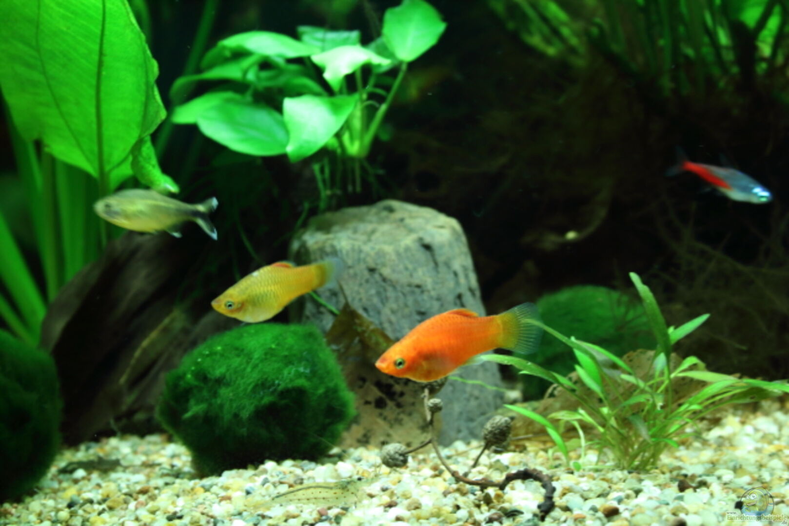 5 Platys (Xiphophorus maculatus) und ein paar Jungfische 2 Diamantkopf-Neonsalmler (Paracheirodon innesi var. Diamant) 10 Kupfersalmler (Hasenania nana) 2 Apistogramma borellii 1w/1m 2 Hechtlinge 1w/1m (Aplocheilus panchax) 4 Geweihschnecken (Clithon diadema) 5 Amanogarnelen (Caridina multidentata) viele Posthornschnecken Der Besatz ist nicht optimal und für 2 Salmlerarten ist das Becken etwas klein.