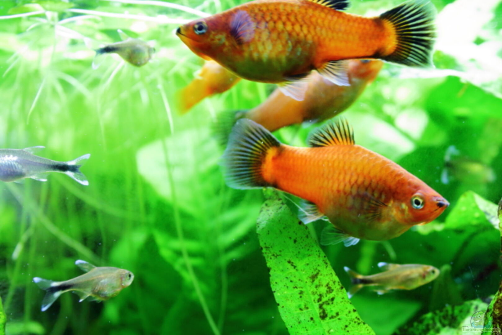 5 Platys (Xiphophorus maculatus) und ein paar Jungfische 2 Diamantkopf-Neonsalmler (Paracheirodon innesi var. Diamant) 10 Kupfersalmler (Hasenania nana) 2 Apistogramma borellii 1w/1m 2 Hechtlinge 1w/1m (Aplocheilus panchax) 4 Geweihschnecken (Clithon diadema) 5 Amanogarnelen (Caridina multidentata) viele Posthornschnecken Der Besatz ist nicht optimal und für 2 Salmlerarten ist das Becken etwas klein.