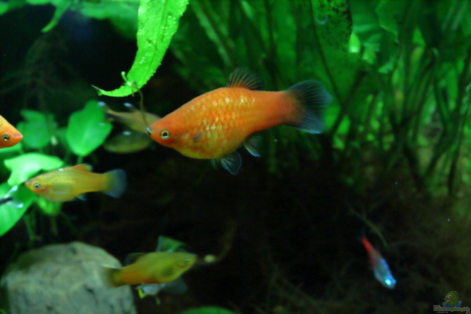 5 Platys (Xiphophorus maculatus) und ein paar Jungfische 2 Diamantkopf-Neonsalmler (Paracheirodon innesi var. Diamant) 10 Kupfersalmler (Hasenania nana) 2 Apistogramma borellii 1w/1m 2 Hechtlinge 1w/1m (Aplocheilus panchax) 4 Geweihschnecken (Clithon diadema) 5 Amanogarnelen (Caridina multidentata) viele Posthornschnecken Der Besatz ist nicht optimal und für 2 Salmlerarten ist das Becken etwas klein.