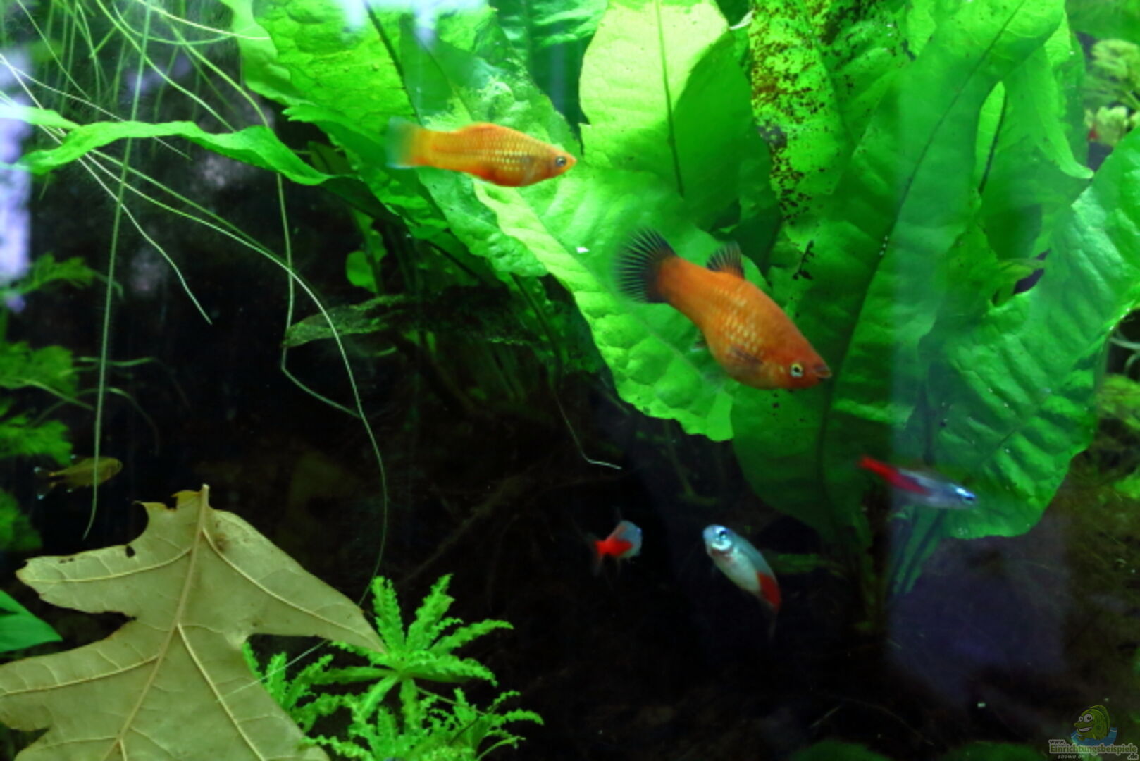 5 Platys (Xiphophorus maculatus) und ein paar Jungfische 2 Diamantkopf-Neonsalmler (Paracheirodon innesi var. Diamant) 10 Kupfersalmler (Hasenania nana) 2 Apistogramma borellii 1w/1m 2 Hechtlinge 1w/1m (Aplocheilus panchax) 4 Geweihschnecken (Clithon diadema) 5 Amanogarnelen (Caridina multidentata) viele Posthornschnecken Der Besatz ist nicht optimal und für 2 Salmlerarten ist das Becken etwas klein.