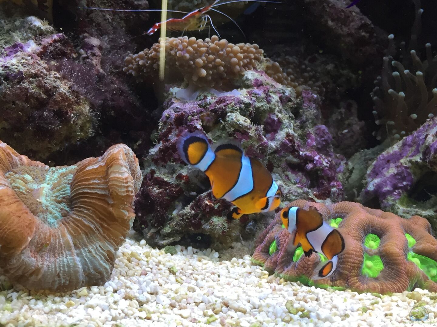 3 Amphiprion ocellaris (falscher Clownfisch), hatte zuerst 1 Pärchen, leider ist 1 Fisch eingegangen. Hinterher wurde ein weiteres Pärchen bestellt. Bisher vertragen sich alle 3 sehr gut. Sofern sich ein Pärchen herauskristallisiert, wird der 3. Fisch weggegeben. 1 Cryptocentrus cinctus (Zitronengrundel) in Symbiose mit einem Alpheus bellulus (Hübscher Knallkrebs) 1 Koumansetta rainfordi (Rainfords Grundel) 3 Chromis viridis (Grüne Schwalbenschwänzchen) 1 Gramma Loreto (Königs-Feenbarsch) 4 [...]
