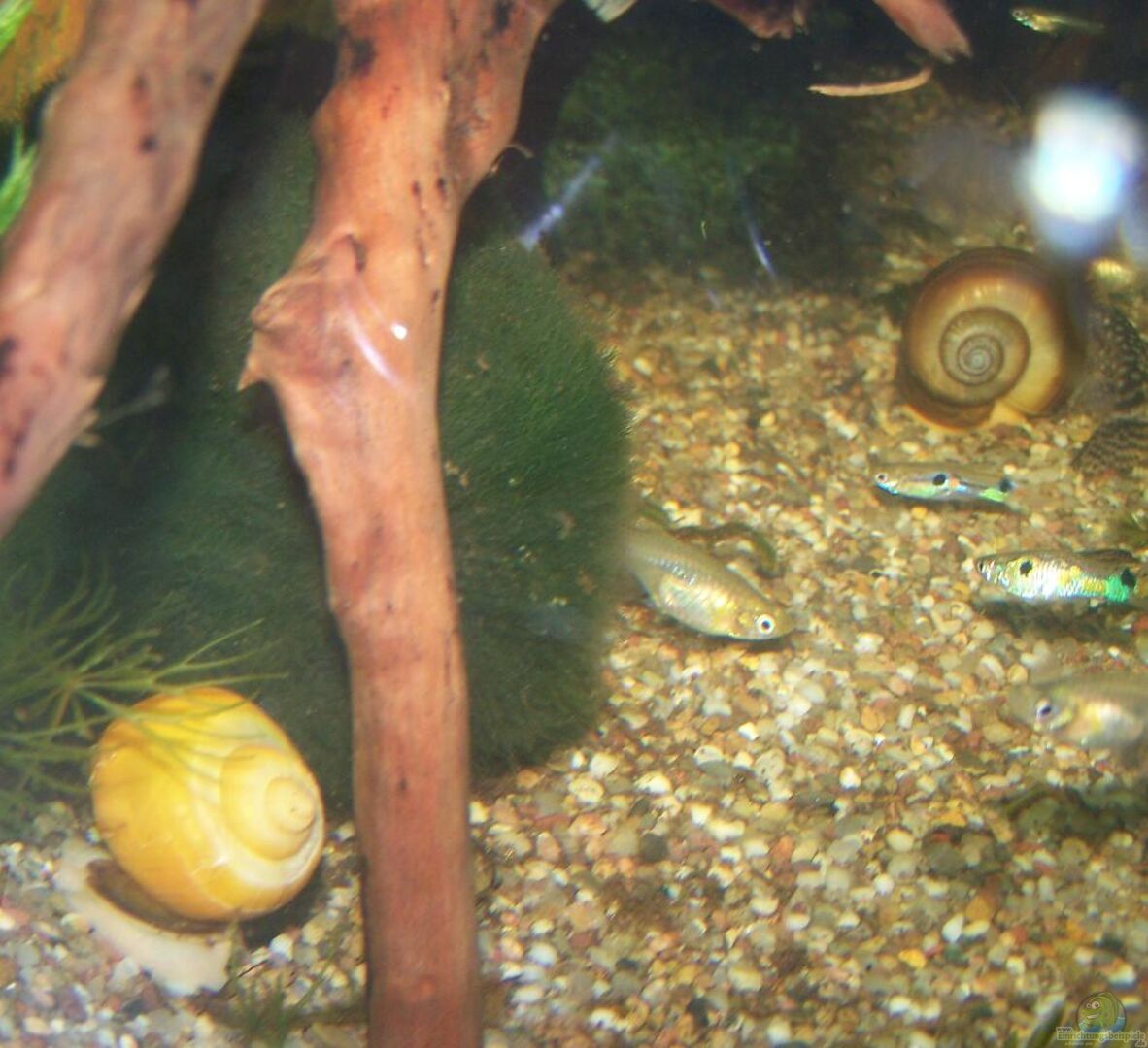 ´Guppybach´-Guppies ( einheimische Tiere aus einer Kläranlage/ Warmwasserableitung ) Brauner Antennenwels (Nachwuchs) Camberellus Montezumae lermensis Turmdeckelschnecken Blasenschnecken Apfelschnecken braun und gold