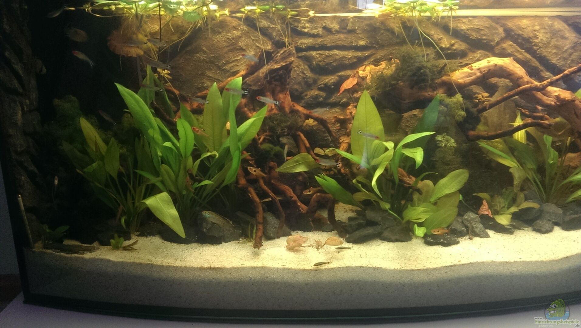 - 3 Maroni-Buntbarsche (ca. 6.7cm lang, 3m) - 3 glänzende Zwergbuntbarsche (Nannacara anomala 1m/2w) - 3 rote Hexenwelse - 6 rote Phantomsalmler (2m/4w) - 10 Otocinclus - 16 Rotkopfsalmler (Hemigrammus bleheri) - ca. 10 Amano - Garnelen Eventuell werde ich noch etwas an der Besetzung ändern, da die Rotkopfsalmler sehr viel Raum einnehmen und ich gern noch Spritzsalmler halten möchte...