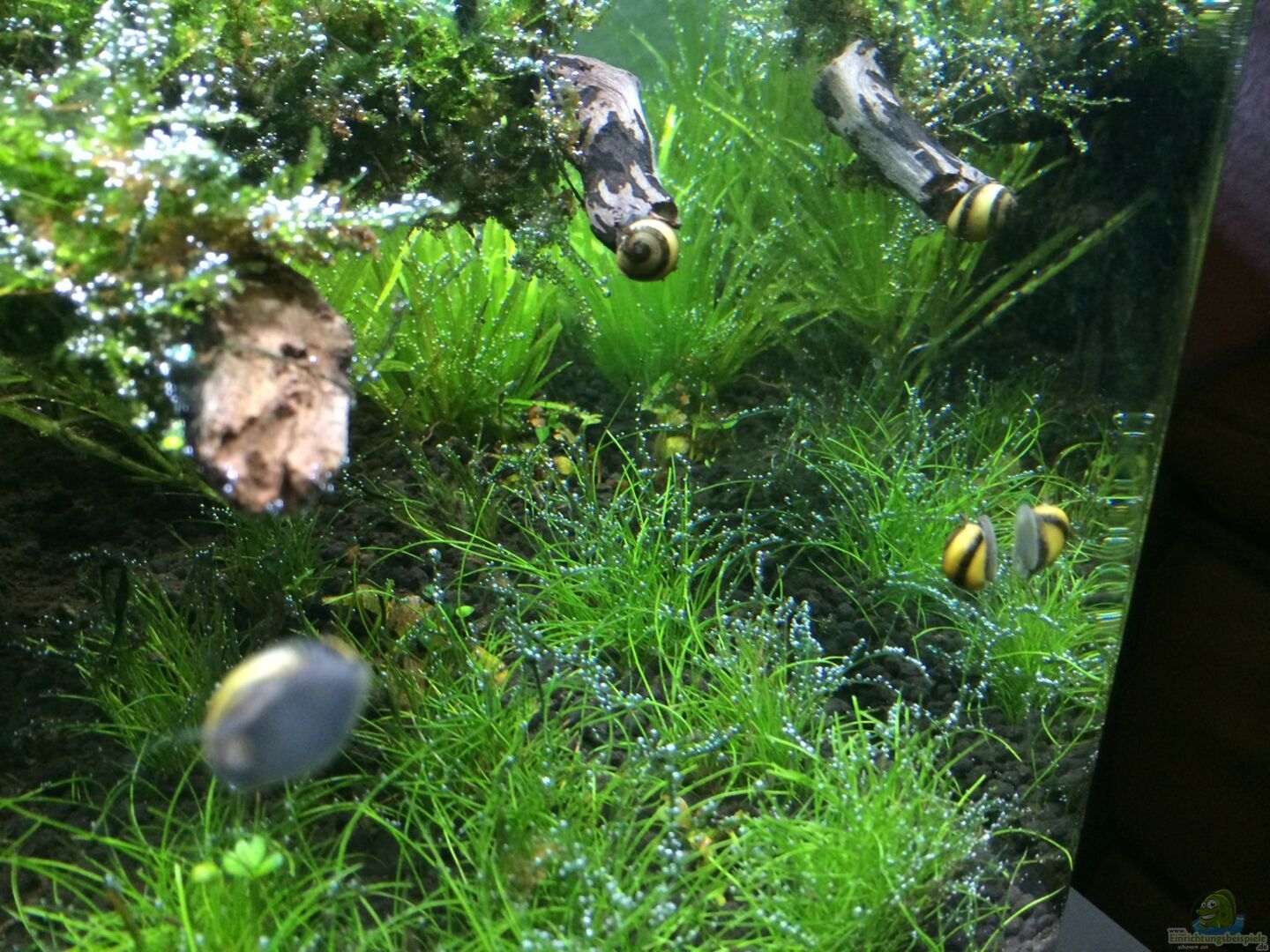 4x Geweihschnecke gelb/schwarz Für Geweihschnecken hab ich mich entschieden weil sie das Aquarium auch an schwierigen Stellen sauber halten. Schön klein und eine gute Konterfarbe zu Grün. Fahren unter Moos rum. Man kann den Schnecken beim Wachsen zusehen. Das Reinigen der Scheibe erübrigt sich vollständig. -