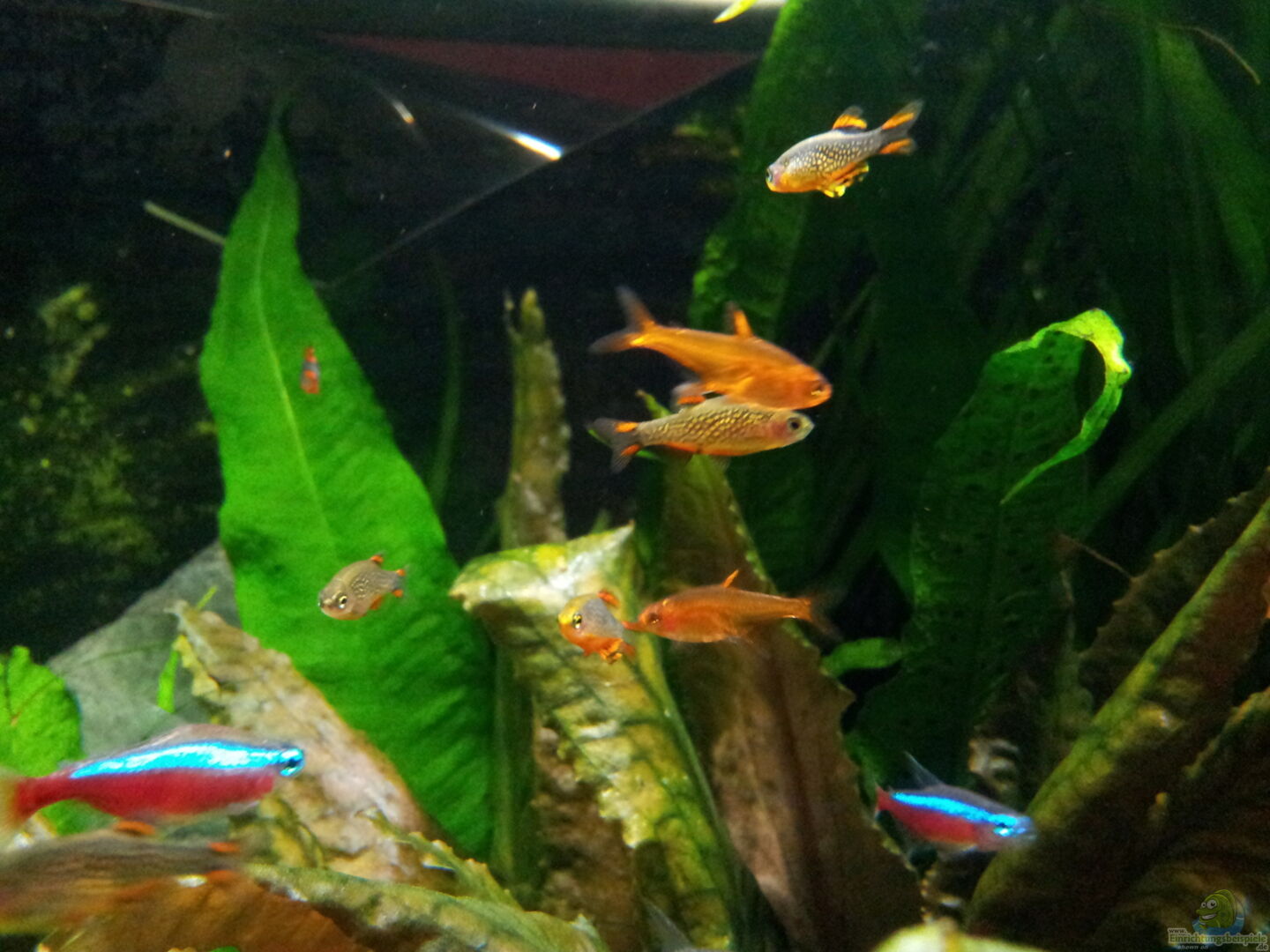 10 Orangeflossen-Panzerwelse (Corydoras sterbai) 1 Pärchen Smaragtbuntbarsche nigeria red (Pelvicachromis taeniatus) 20 Roter Neonsalmler (Paracheirodon axelrodi) 16 Funkensalmler (Hyphessobrycon amandae ) 10 Perlhuhnbärblinge (Danio margaritatus) 4 Zebrarennschnecken (Vittina coromandeliana) unzählige Raubschnecken (Anentome Helena)