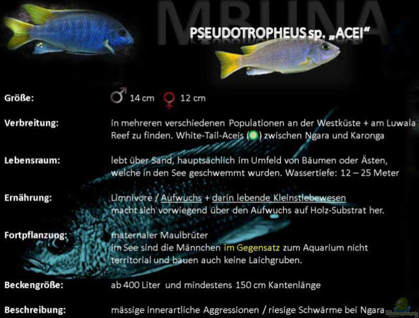 Der Buntbarsch Besatz Dieser Besatz setzt sich wie folgt zusammen: Mbuna Pseudotropheus sp. 'acei' - 10 Tiere Nonmbuna Placidochromis phenochilus 'mdoka' - 8 Tiere Aulonocara stuartgranti 'hongi' - 6 Tiere 3 Männchen & 3 Weibchen Mylochromis ericotaenia Lumbaulo - Mosambik -10 Tiere Welse Hier kommen für mich nur Welse in Frage die auch aus dem Malawisee stammen ! Synodontis Njassae - 2 Tiere Zum endgültigen [...]