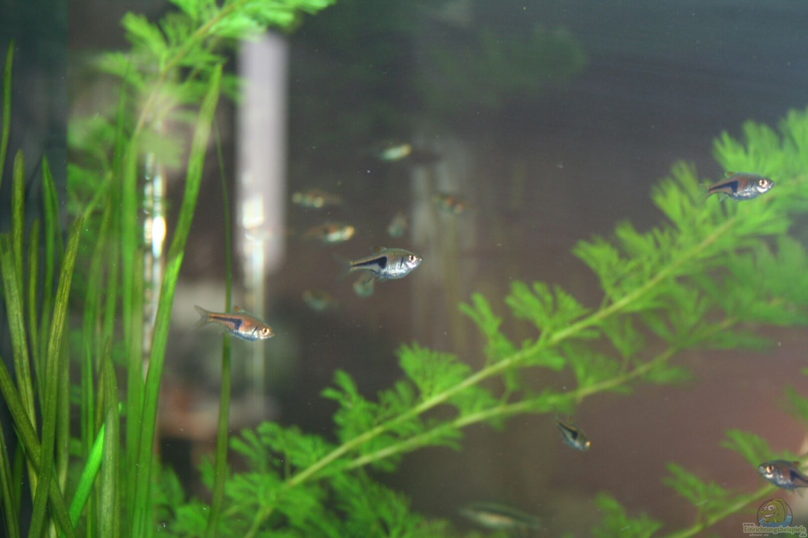 30 St. Keilfleckbärblinge 5 St. Rüsselbarben (sind in ein grö??eres Becken umgezogen) 5 St. Panzerwelse 1 Paar Schmetterlingsbuntbarsche (gold) (Mikrogeophagus ramirezi) 1 Paar Zwergfadenfische (Colisa labiosa) 9 St. Amanogarnelen