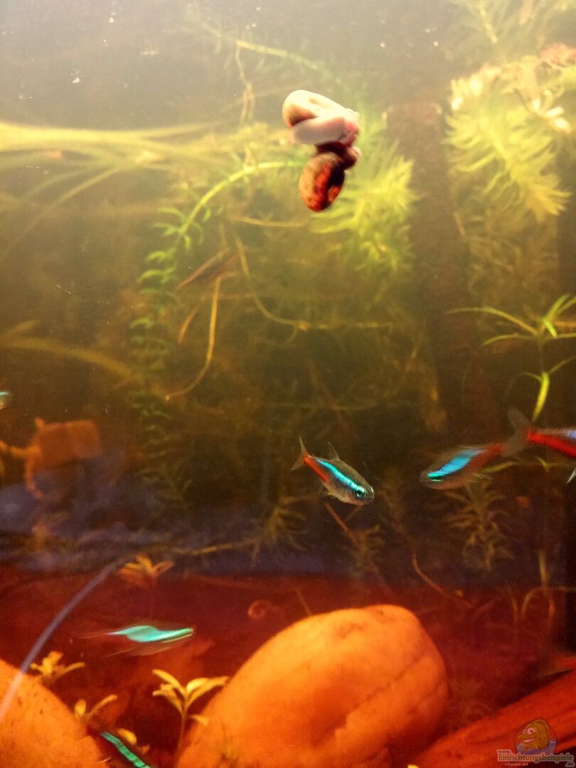 Es sollten Tiere sein, die sich zum Einen in einem Schwarzwasser-Becken mit Zimmertemperatur wohlfühlen, als auch meine schon vorhandenen Armanos und Perlhühner aufnehmen kann. Alle Tiere sind in etwa gleich gro?? und sind für ein friedliches Wesen bekannt. Daher folgender Besatz: 25 Neonsalmer, 8 Perlhunbärblinge (eigene Nachkommen), 4 Armanogarnelen aus meinem Garnelenbecken, Posthornschnecken, Geweihschnecken. Nach 2 Monaten Laufzeit des Beckens habe ich nun auch 6 Ohrgitterharnischwelse dazugesetzt. [...]