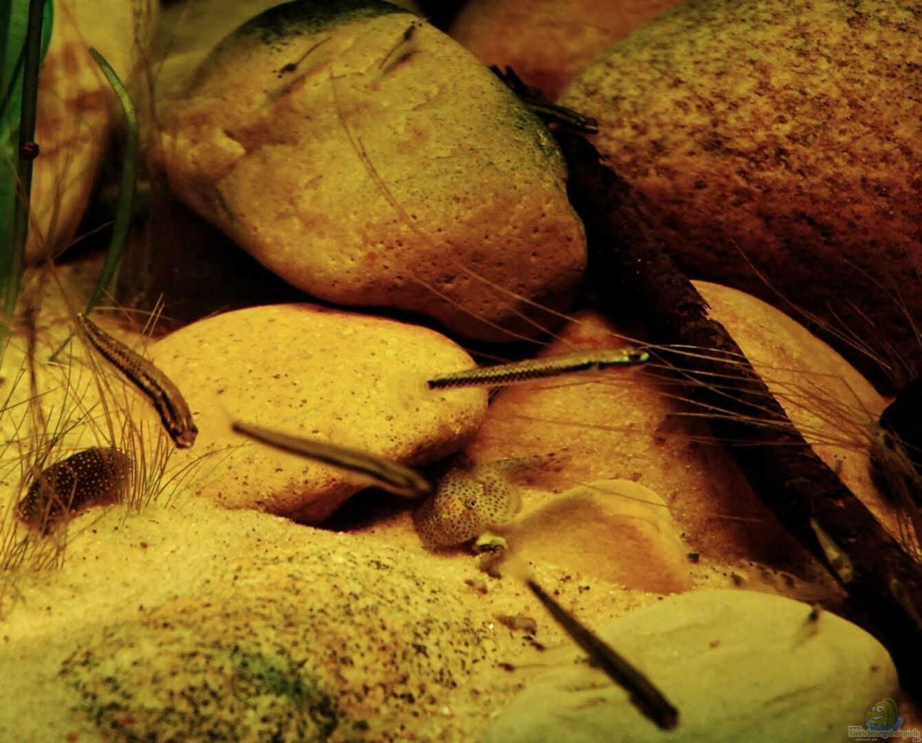 2/3 ? Beaufortia kweichowensis 1 Gastromyzon ctenocephalus 1/4 ? Stiphondon elegans unzählige White Pearl Garnelen -> werden regelmä??ig abgegeben oder auch an die Buntbarsche verfüttert. Rote Posthornschnecken Turmdeckelschnecken