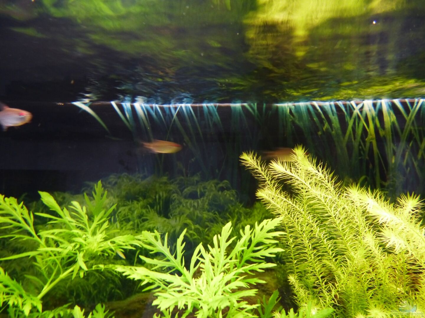 10 Rotaugen-Moenkhausia (Moenkhausia sanctaefilomenae) 10 Glühlichtsalmler (Hemigrammus erythrozonus) 10 Amanogarnelen (Caridina multidentata) div. Turmdeckel- und Blasenschnecken Ich überlege noch eine Welsart zuzufügen oder die Amanos zu erhöhen, Vorschläge? Die Rotaugen sind momentan noch sehr schüchtern und schwimmen sofort in Verstecke wenn man zu nahe kommt. Denke das Becken ist noch zu hell, bei weiterem Pflanzenwuchs und damit etwas mehr Abschattung sollte sich das geben. [...]