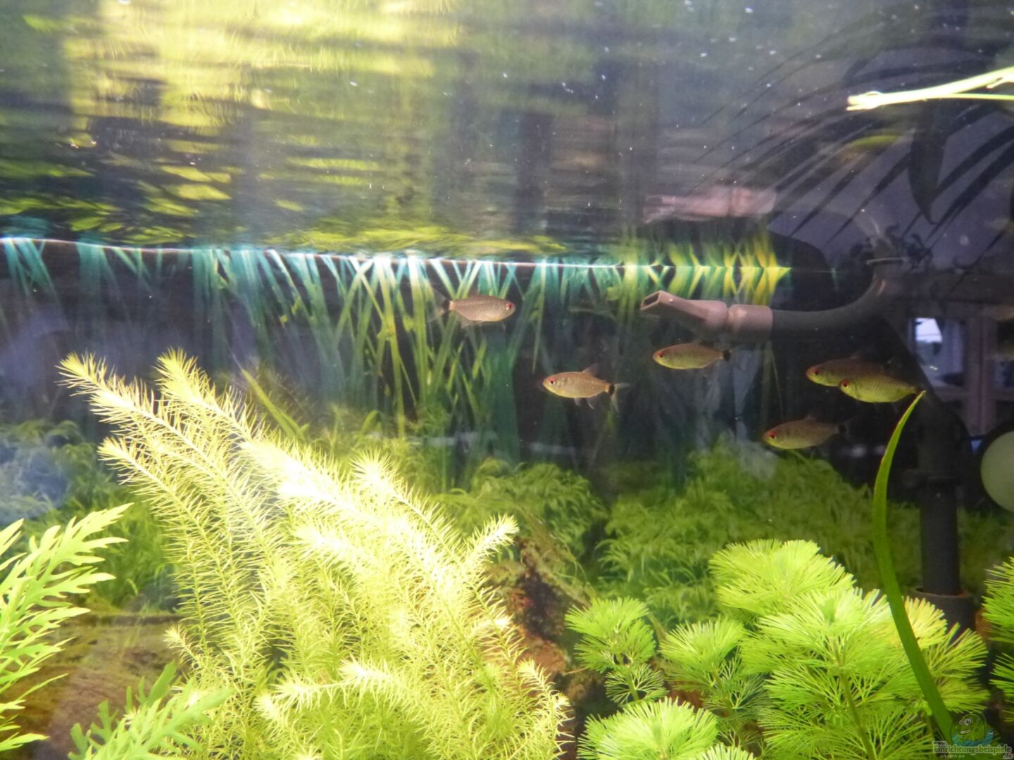 10 Rotaugen-Moenkhausia (Moenkhausia sanctaefilomenae) 10 Glühlichtsalmler (Hemigrammus erythrozonus) 10 Amanogarnelen (Caridina multidentata) div. Turmdeckel- und Blasenschnecken Ich überlege noch eine Welsart zuzufügen oder die Amanos zu erhöhen, Vorschläge? Die Rotaugen sind momentan noch sehr schüchtern und schwimmen sofort in Verstecke wenn man zu nahe kommt. Denke das Becken ist noch zu hell, bei weiterem Pflanzenwuchs und damit etwas mehr Abschattung sollte sich das geben. [...]