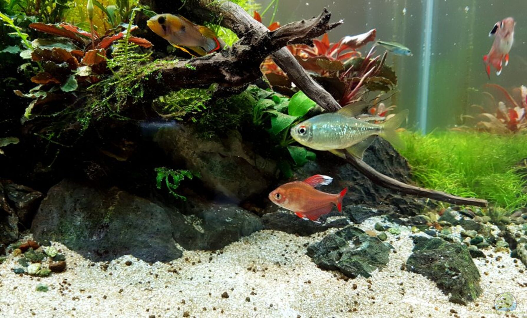 Der bunte Mix des Besatzes: In dem Becken sammeln sich alle meine "Restbestände" aus meinen anderen Aquarien. Da ich mich von den Tieren nicht trennen kann und meistens auch nur noch 1 bis 3 Tiere einer Art vorhanden sind, finden sie hier noch einen "Zufluchtsort". Vorerst soll keine Art aufgestockt werden. - 2x Apistogramma panduro (Zwergbuntbarsch 1/1) - 1x Moenkhausia pittieri (Brillantsalmler) - 3x Hyphessobrycon rosaceus var. 'White fin' (Schmucksalmler) - [...]