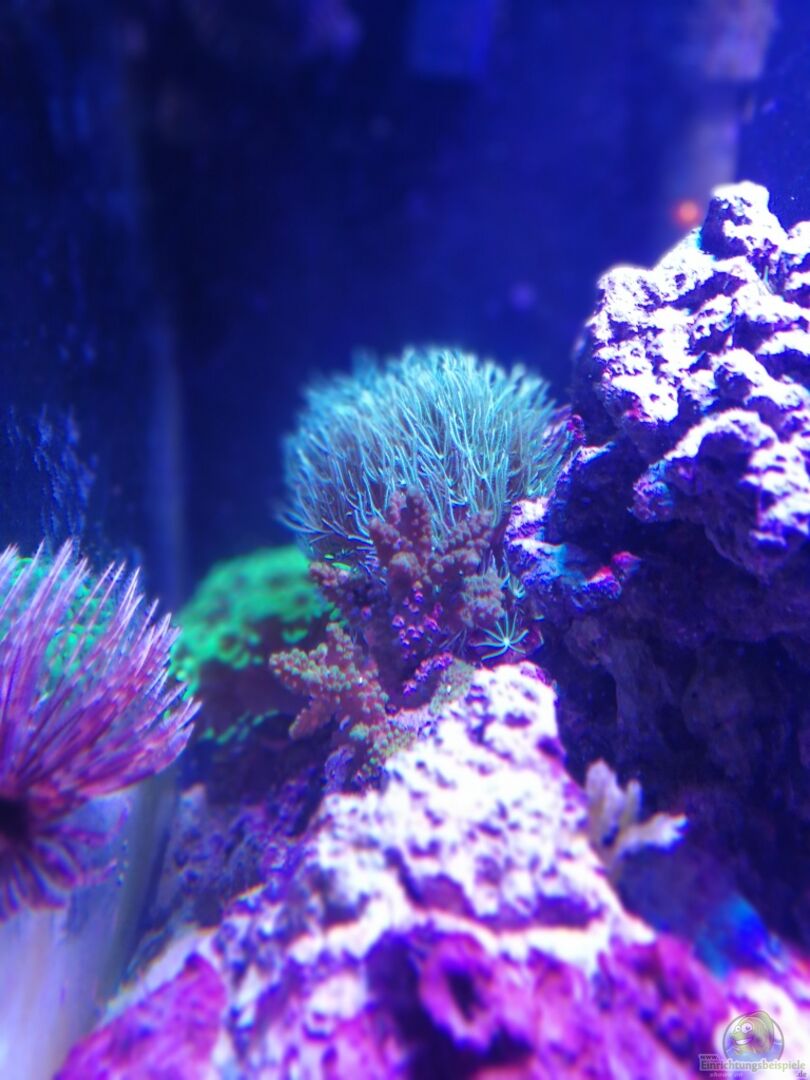 Tiere: 2x Einsiedlerkrebse 3x Schnecken 1x Röhrenwurm 1x Goldstirnschläfergrundel Korallen: -Pachyclavularia violacea -Euphylia ancora -Tubipora musica -Seriotopora caliendrum -Seriopora hystrix -Acropora sp. -Krustenanemone/Zoanthus -Stylophora "Milka" -Parazoanthus gelb Algen: -rote Alge - Aus dem LG: 1x Rundkrabbe -versch. Anemonen -Ohrschnecken -Schlangenseesterne