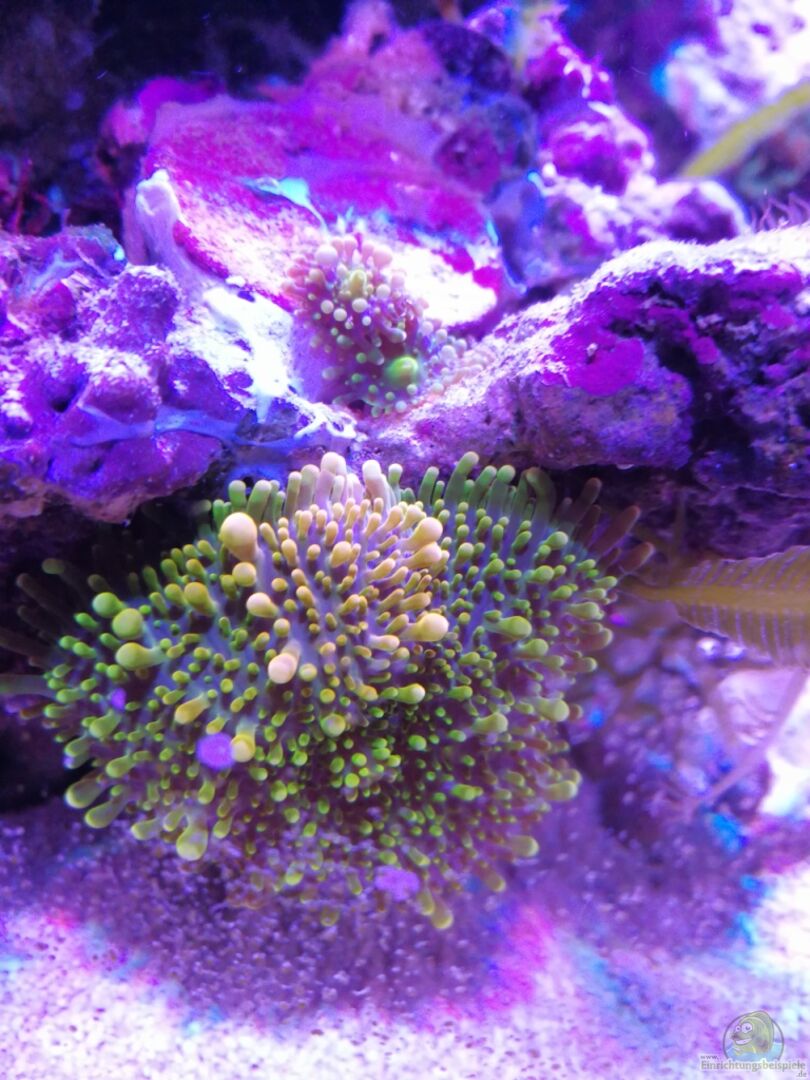Tiere: 2x Einsiedlerkrebse 3x Schnecken 1x Röhrenwurm 1x Goldstirnschläfergrundel Korallen: -Pachyclavularia violacea -Euphylia ancora -Tubipora musica -Seriotopora caliendrum -Seriopora hystrix -Acropora sp. -Krustenanemone/Zoanthus -Stylophora "Milka" -Parazoanthus gelb Algen: -rote Alge - Aus dem LG: 1x Rundkrabbe -versch. Anemonen -Ohrschnecken -Schlangenseesterne