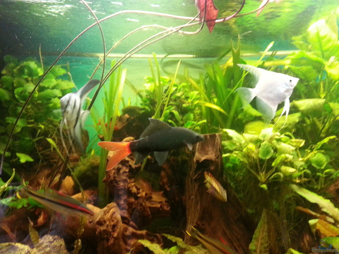 ca. 20 Bitterlingsbarben, Puntius titteya 5 Rotstrichalgenfresser, Puntius denisonii 1 Pärchen Skalar, Pterophyllum scalare (1 Blauer und 1 Platin) 1 Pärchen Purpurprachtbarsche, Pelvicacromis Pulcher (derzeit sogar mit Nachwuchs) 4 Zierbindenzwergschilderwelse, Peccolita vittata 1 Goldener Antennenwels 2 Längsband-Saugbarbe, Garra cambodgiensis 1 Goldene Saugschmerle 1 Grüner Fransenlipper, Epalzeorhynchos frenatus 1 Feuerschwanz, Epalzeorhynchos bicolor 8 Prachtschmerlen, [...]