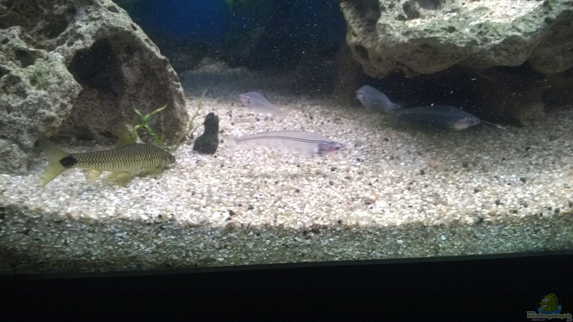 Momentaner Besatz. -9 Stk. Fünfgürtelbarben (4w, 5m) -3 Stk. Goldbrauner Algenfresserfisch (2w, 1m / Vermutung lt. Balzverhalten) -3 Stk. Marmor-Fadenfische (2w, 1m) -1 Stk. Bratpfannenwels (vermutlich w) -6 Stk. Panzerwels (Corydoras agassizii) -3 Stk. Peruanischer Waldwels (Hubschrauberwels) -2 Stk. Zwergkugelfisch (Carinotetraodon Travancorius) (1w, 1m) -13 Stk. Indischer Glaswels -3 Stk. Nadelwels (2w, 1m) -1 Stk. Goldbartwels (Störwels) -10 Stk. Blauer Leuchtaugenfisch -2 [...]