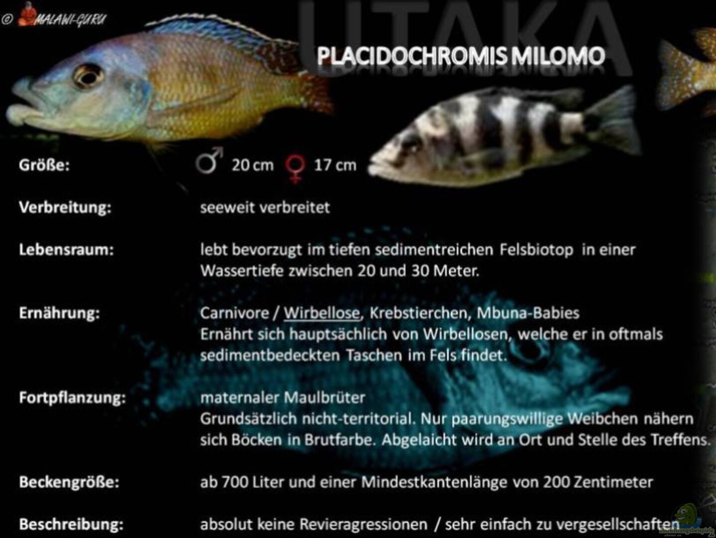 Hier findest Du alle wichtigen Infos zur Haltung und Beispiele für traumhaft schöne Aquarien, die mit Placidochromis milomo besetzt sind.