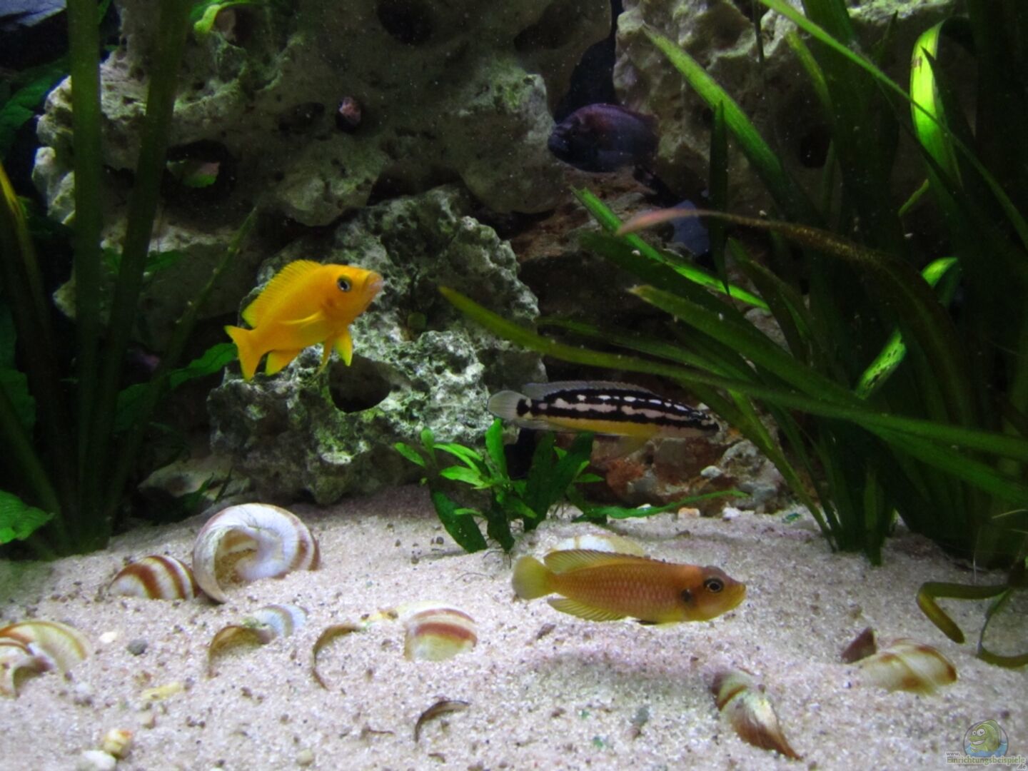 - 1m/2w Neolamprologus ocelatus `Nkamba Bay` - 2m/1w Neolamprologus leleupi `Cap Tembwe` - 1m/1? Neolamprologus cylindricus `Isanga` - 2m/2w Julidochromis transcriptus `Kampampa` - 1m/1w Astatotilapia burtoni - 4x Variabilichromis moorii (Geschlechterverhältnis noch unbekannt) laut meinem jetzigen Informationen sollten 2-3Paare ind 375l Gesellschaftsbecken gut auskommen) ----- 12 Zebrarennschnecken