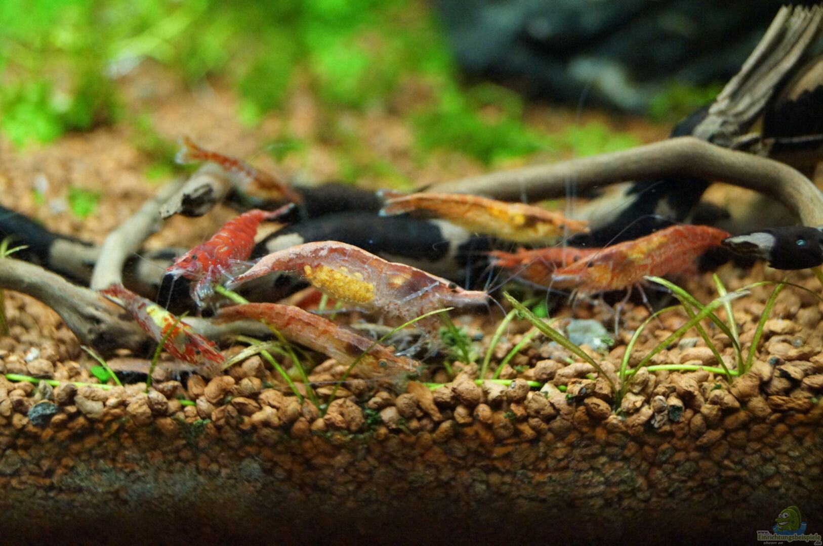 nach 6 Wochen Einlaufphase: - 10 Geweihschnecke gelb-schwarz gestreift / Clithon spec. - ca. 30 Garnelen Red Fire / Neocaridina davidi var. red - x Turmdeckelschnecken geplant ist noch ein kleiner Schwarm (10 Tiere) Moskitobärblinge / Boraras brigittae oder Perlhuhnbärblinge / Danio margaritatus