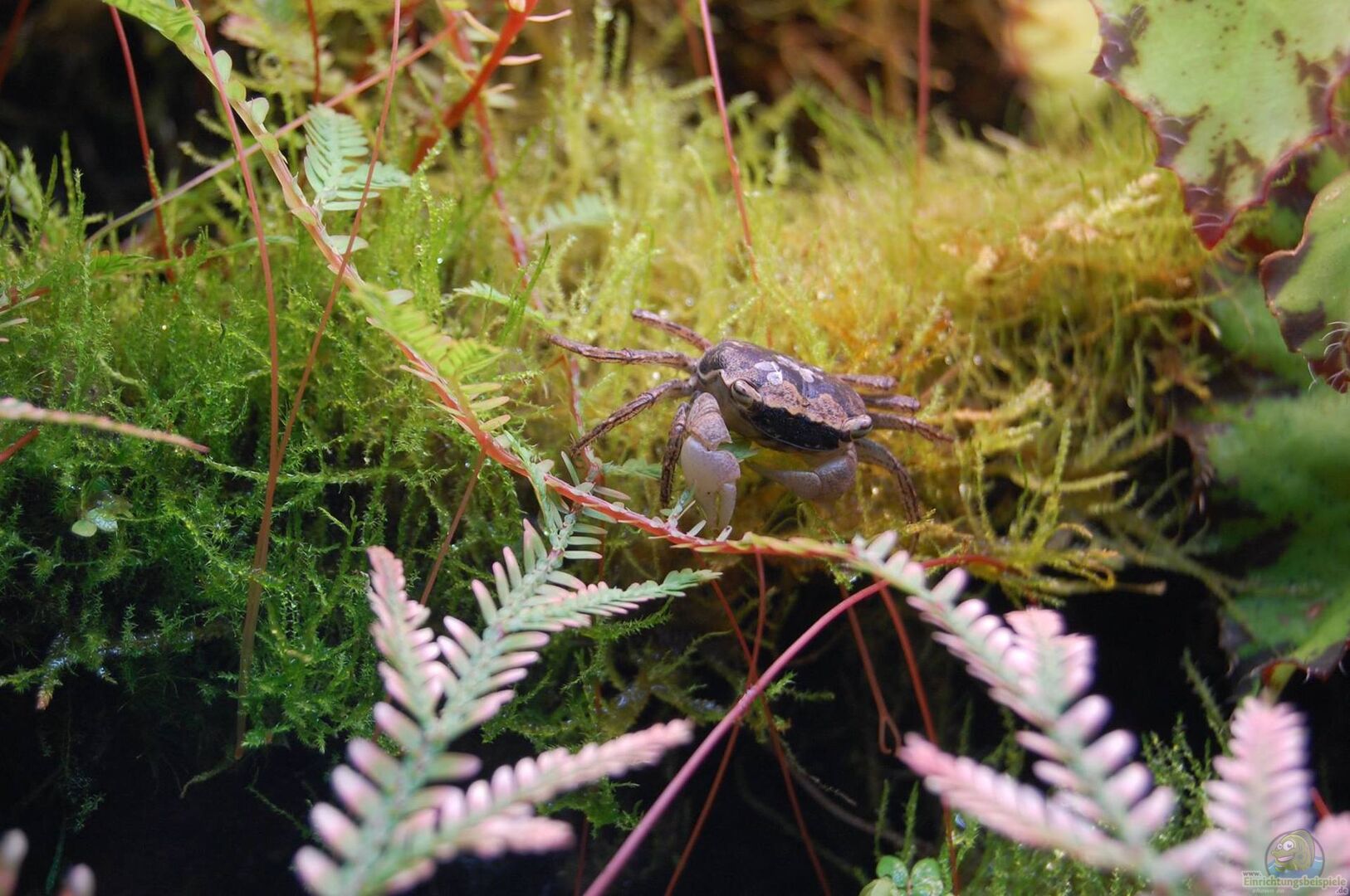 Das Becken ist Lebensraum für ein Pärchen Geosesarma Red Devil. Leider ist das Weibchen verstorben. Das Männchen ist auch schon mind. 2 Jahre alt. Als nächstes Tier möchte ich mir Melanophryniscus klappenbachi, das Schwarzkrötchen zulegen, da ich dafür, denke ich, das ideale Habitat habe. Die Würfel sind gefallen. Heute 20.04.2016 Neueinzug von Geosearma Golden Eye, 1 Männchen, 2 Weibchen;