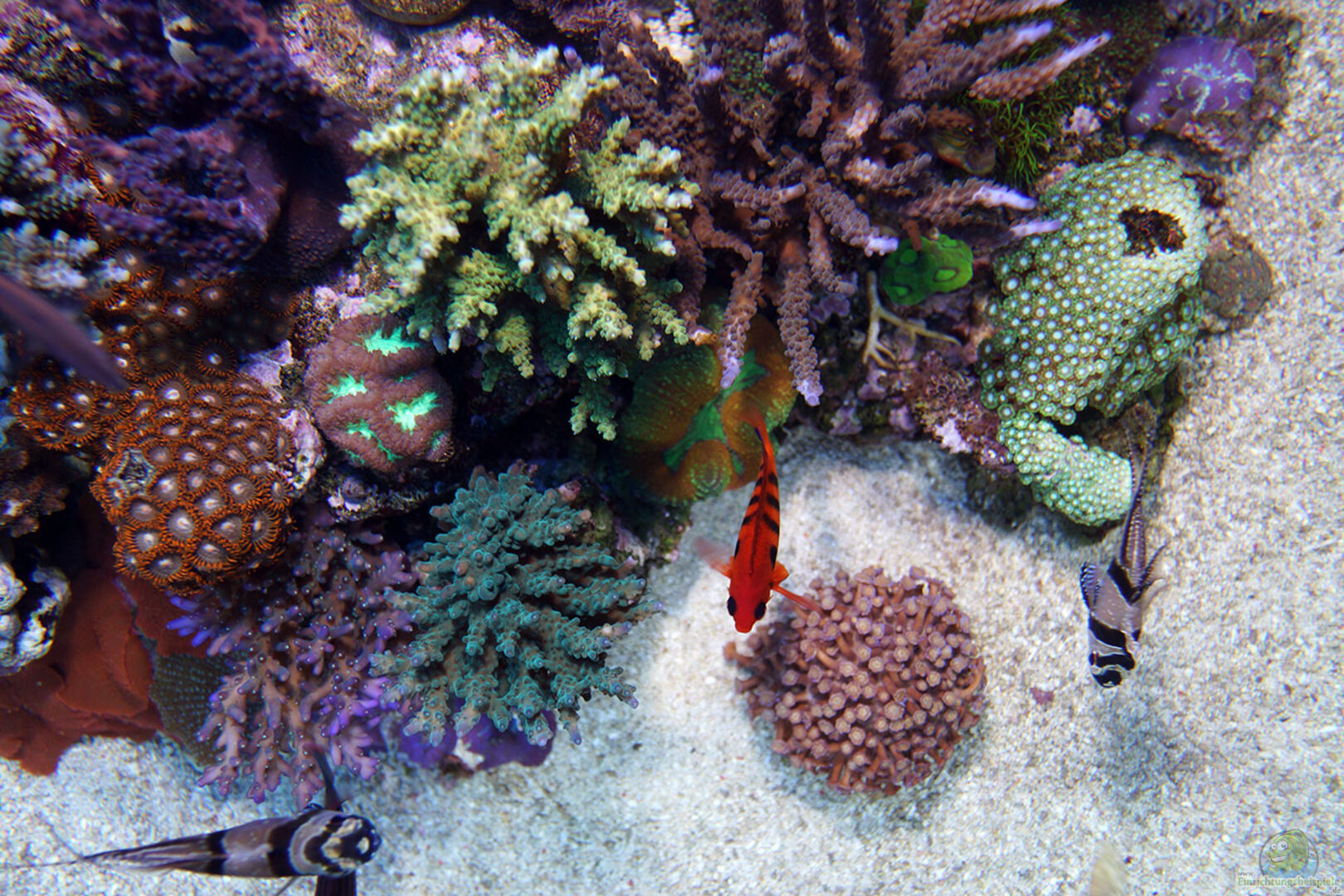 Fische: - 3 x Chromis viridis - grünes Schwalbenschwänzchen - 6 x Pseudanthias squamipinnis - Juwelen Fahnenbarsch - 3 x Pterapogon kauderni - Kardinalbarsch (eigene Nachzucht) - 2 x Amphiprion ocellaris - Falscher Clown-Anemonenfisch - 2 x Chrysiptera hemicyanea - Arzur Riffbarsch - 1 x Acanthurus leucosternon - Pazifik Wei??kehldoktor - 1 x Paracanthurus hepatus - Paletten Doktorfisch - 1 x Zebrasoma scopas - Brauner Segelflossen-Doktor - 1 x Labroides dimidiatus - Putzerlippfisch - [...]