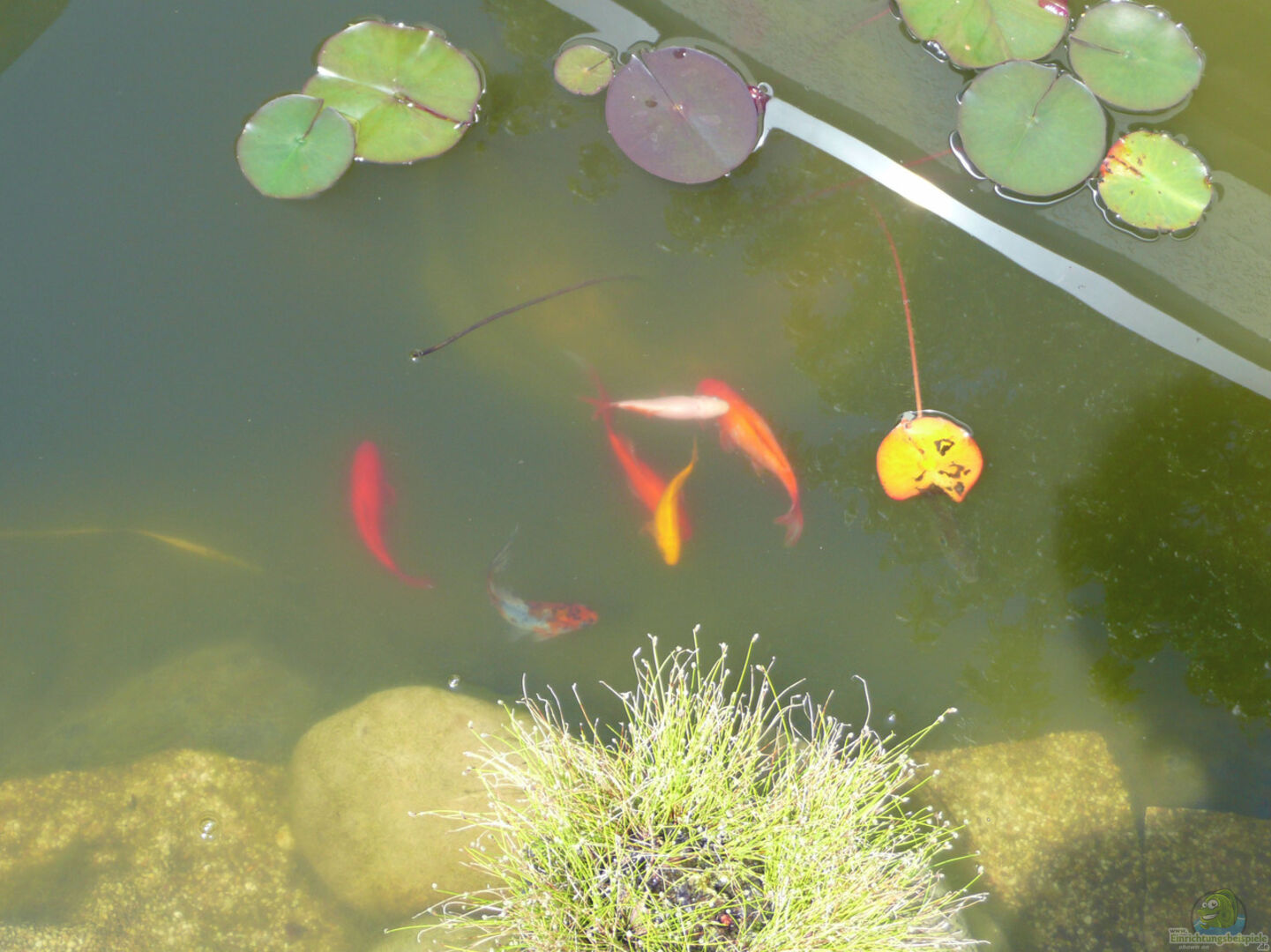 Fische: 6 Goldfische: 2x Gemeiner rot 1x Gemeiner gelb 1x Shubunkin 2x Sarasa 1x Sonnenbarsch (Männlich) Alles was von selbst ins und ans Wasser kommt: Libellen, Wasserläufer, etc.