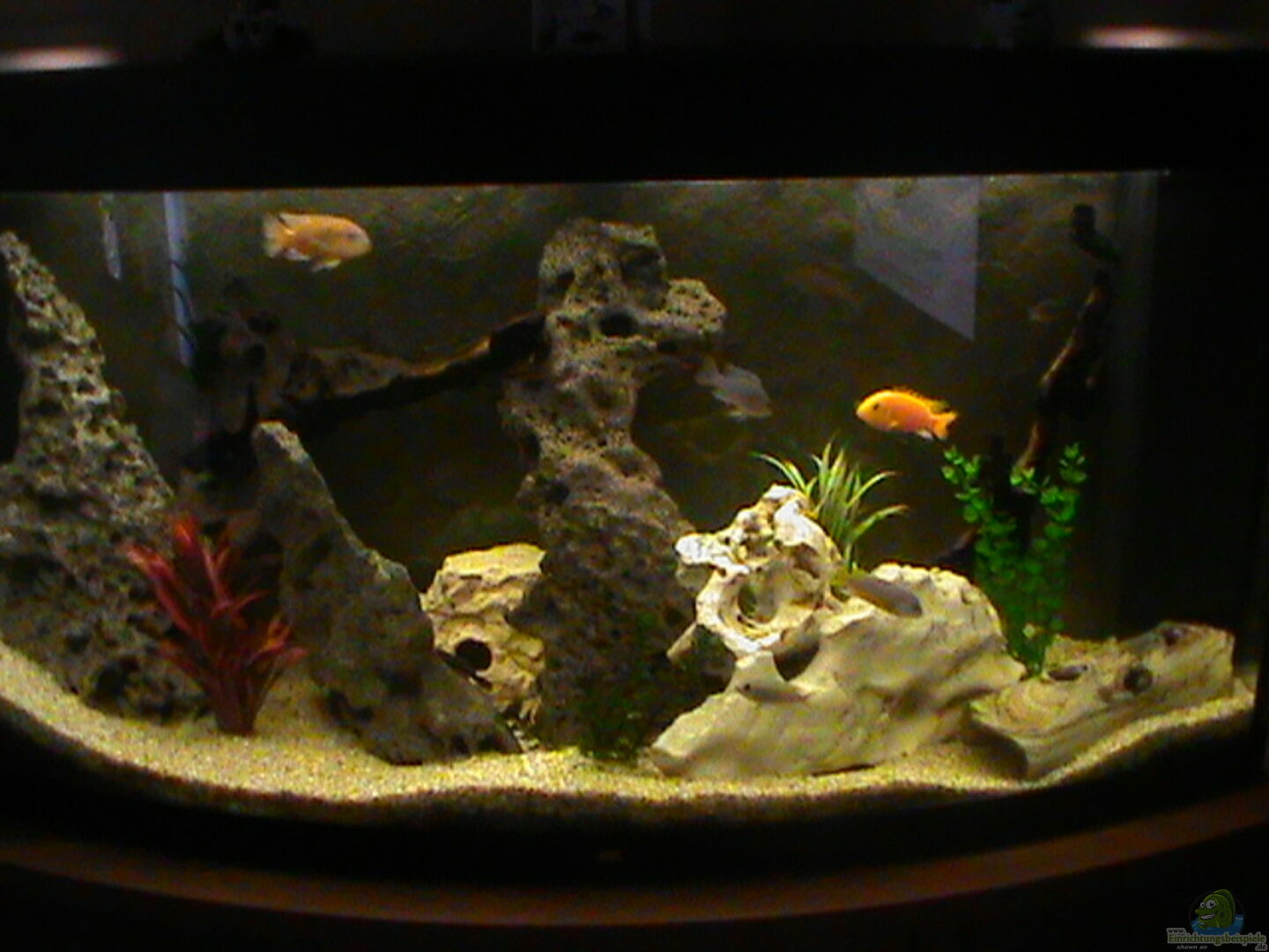Das Aquarium steht auf einem selbstgebautem Unterschrank, am Boden befindet sich eine Matte als Unterlage für die Steine!