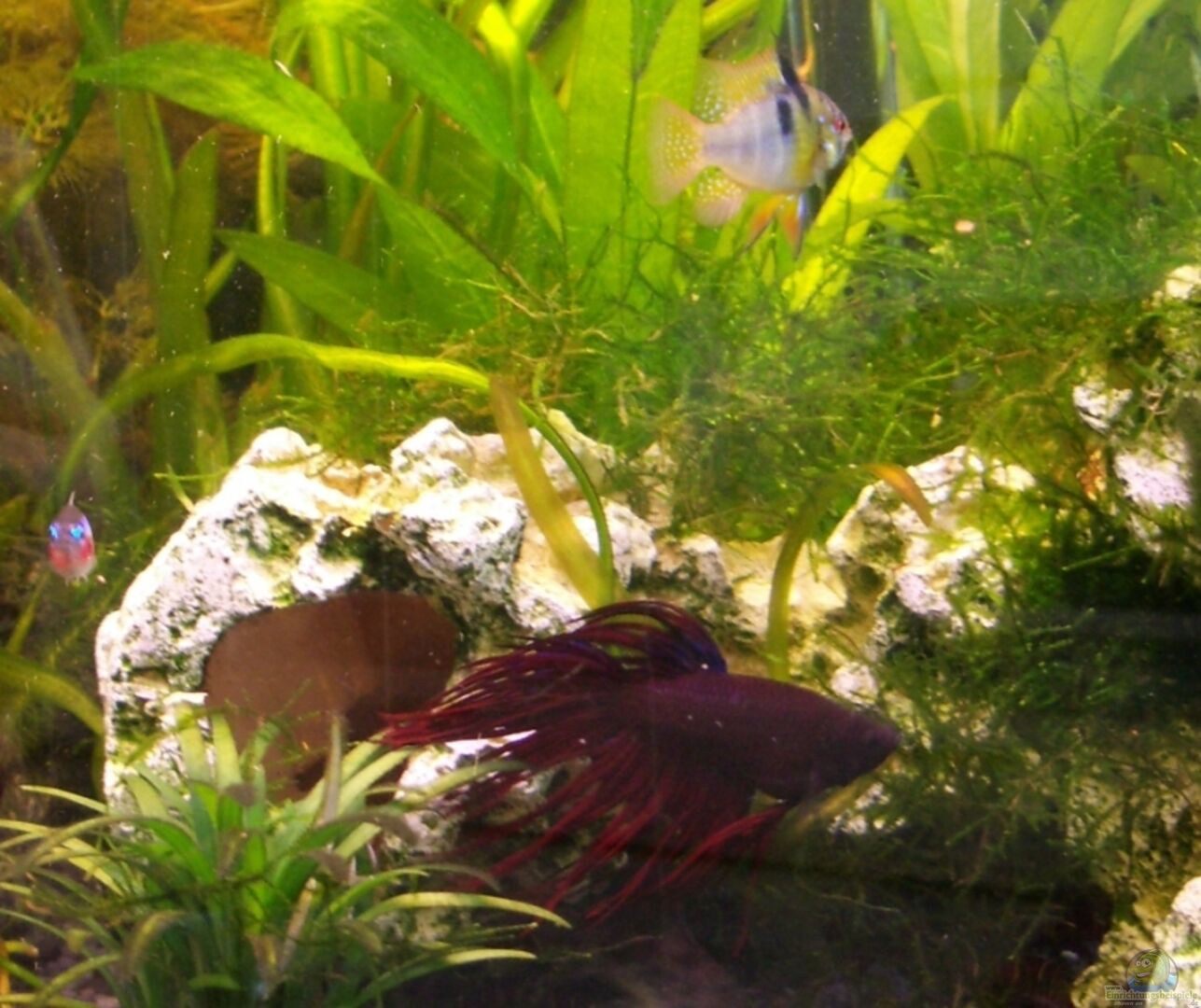 1x Betta splendens (m) --- Kampffisch 12x Paracheirodon axelrodi --- Roter Neon 2x Apistogramma ramirezi (1m/1w) --- Schmetterlingsbuntbarsch 8x Pangio kuhlii --- Dornaugen 6x corydoras paleatus --- Gefleckter Panzerwels 2x Apfelschnecken