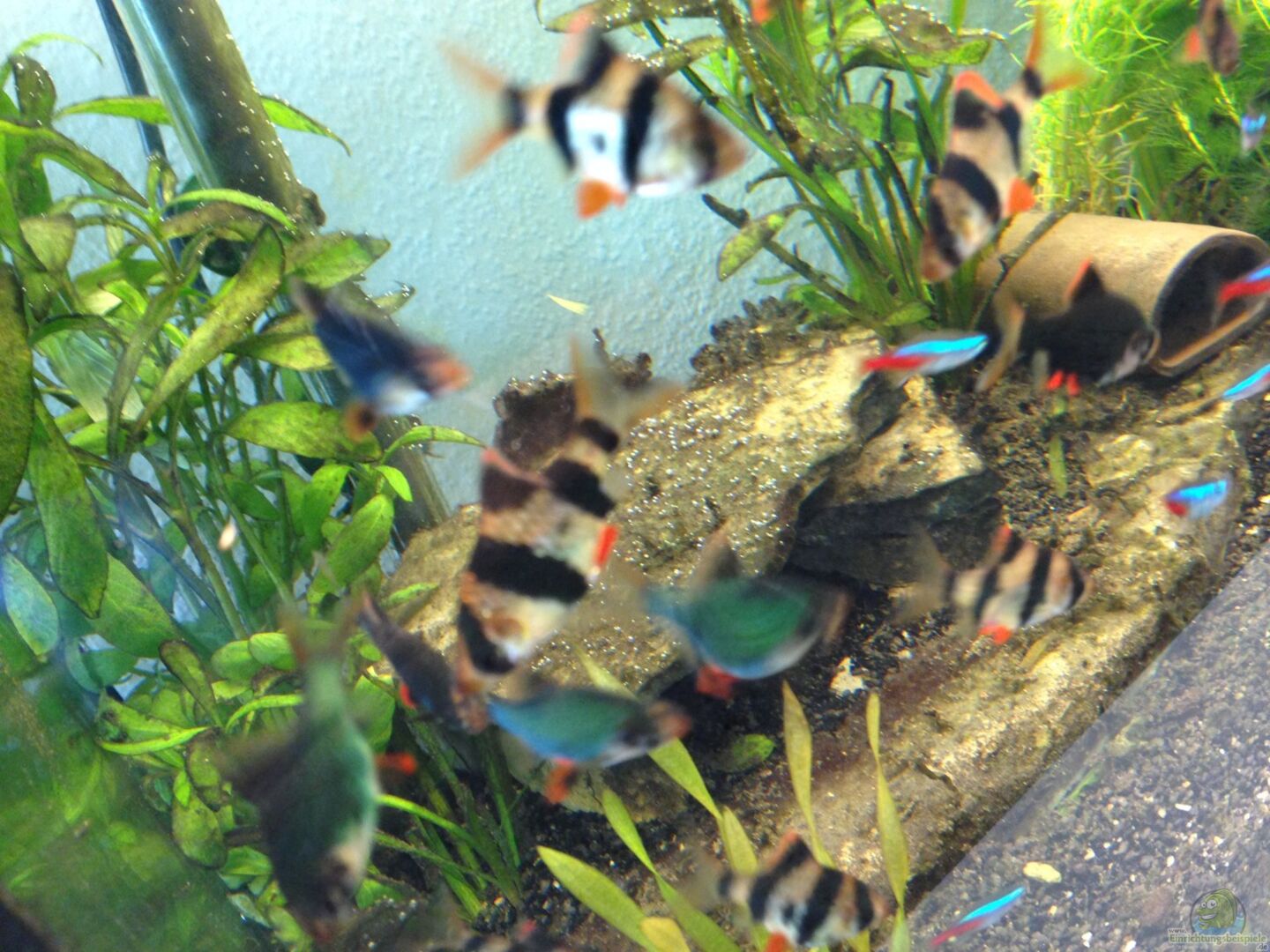 8 Fünfgürtelbarbe 6 Moosbarbe 10 Rote Neons 1 Mal Zebraschmerle (??berlebende aus alten Becken) 8 Metallpanzerwelse 1 Black Molly