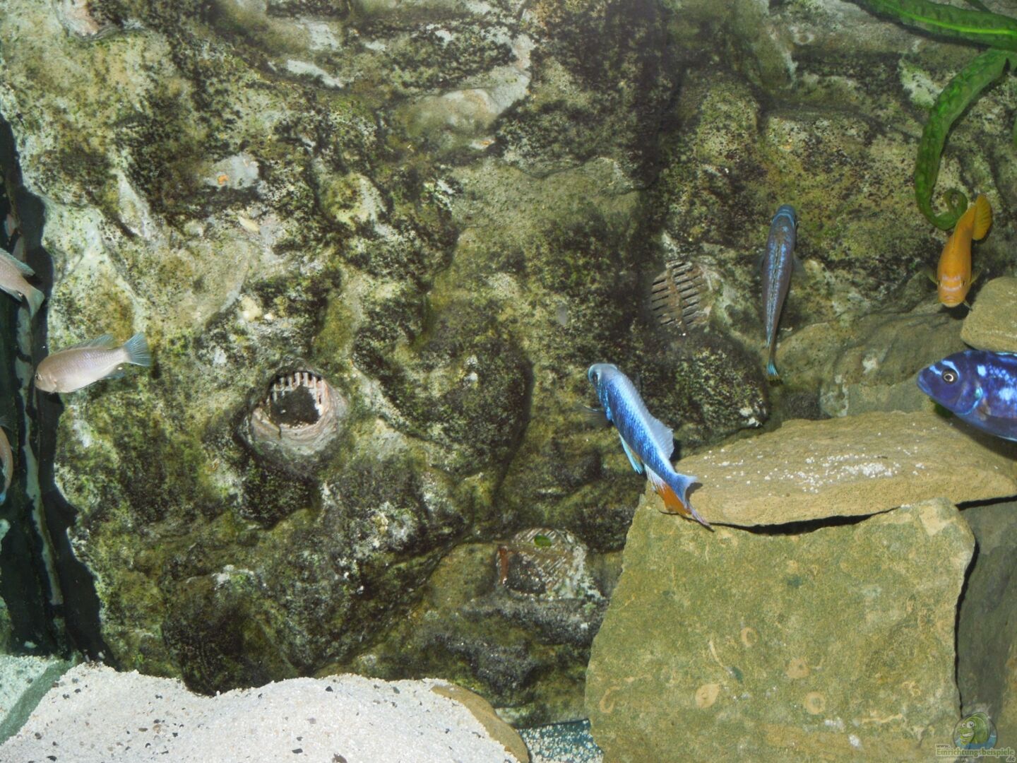 -------- Zur weiteren Einrichtung habe ich mich für Sandgestein endschieden, es befindet sich ca. 120Kg dieses Gesteins im Becken. Das Sandgestein ist über die gesamte Rückseite als Abruch aufgestapelt. Hierdurch entstanden viele Höhlen und Spalten in denen sich bedrängte Tiere sowie Mutter und Jungtiere verstecken können. Als Unterlage und Schutz für die Bodenscheibe dient eine Plexiglasscheibe die mit Silikon fixiert wurde.
