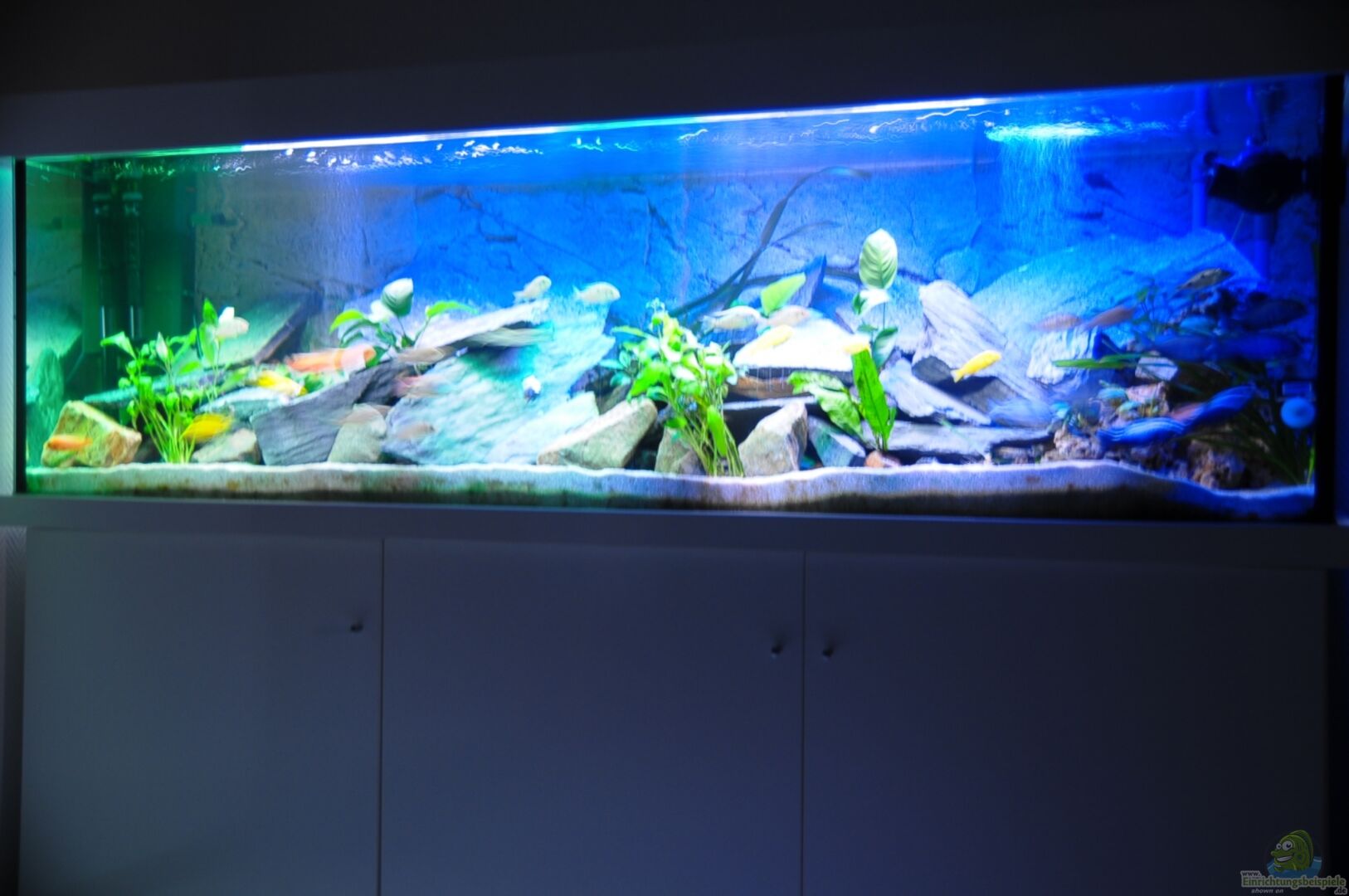 Beleuchtung : 2 T8 Röhren, die vordere Röhre ist eine Aqua-Glo der Firma Hagen.Die hintere Röhre ebenfalls.Beide Röhren sind mit Alufolie abgedunkelt und zum Teil mit blauer und grüner Folie umwickelt.Beide Röhren haben 36 watt. Aquarium: 12mm Sicherheitsverglasung sowie Verklebung. Bodenbereich 2 Bohrungen für Pumpensystem. Bodenplatte habe ich eine 20mm Styrodurplatte eingelegt für den Steinaufbau Da wir gerade ein Haus gekauft haben, wollten wir es dem Wohnzimmer anpassen. Wei?? [...]